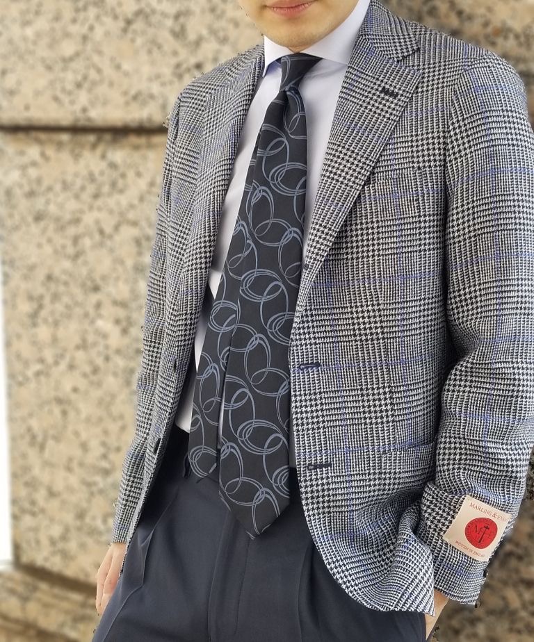 ウールリネンシルク三者混のグレンチェック柄で清涼感ある英国生地のサマーツイードジャケットに仕上げています😆😆