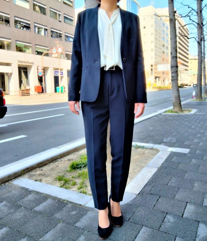 ホワイトカットソーとネイビースーツの定番コーディネイト✨