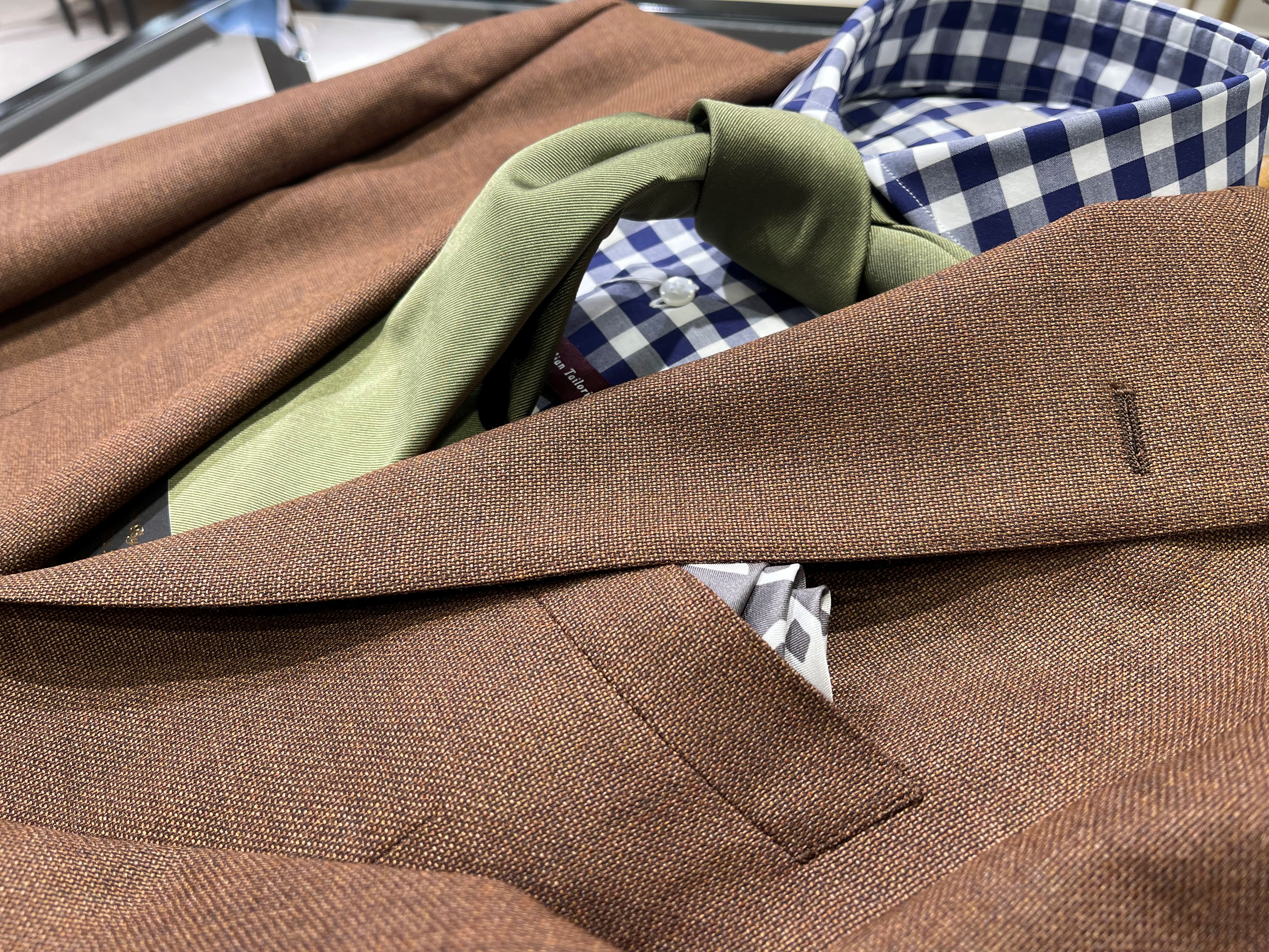 ブラウンのジャケットにネイビーのシャツ、グリーンのネクタイでアースカラーにまとめてみました(^^)