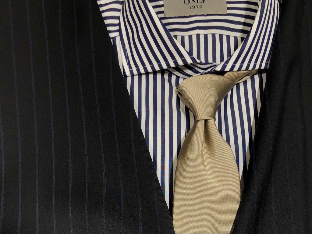 ブルーのカラーを配したスマートな印象を与える広幅のチョークストライプ。