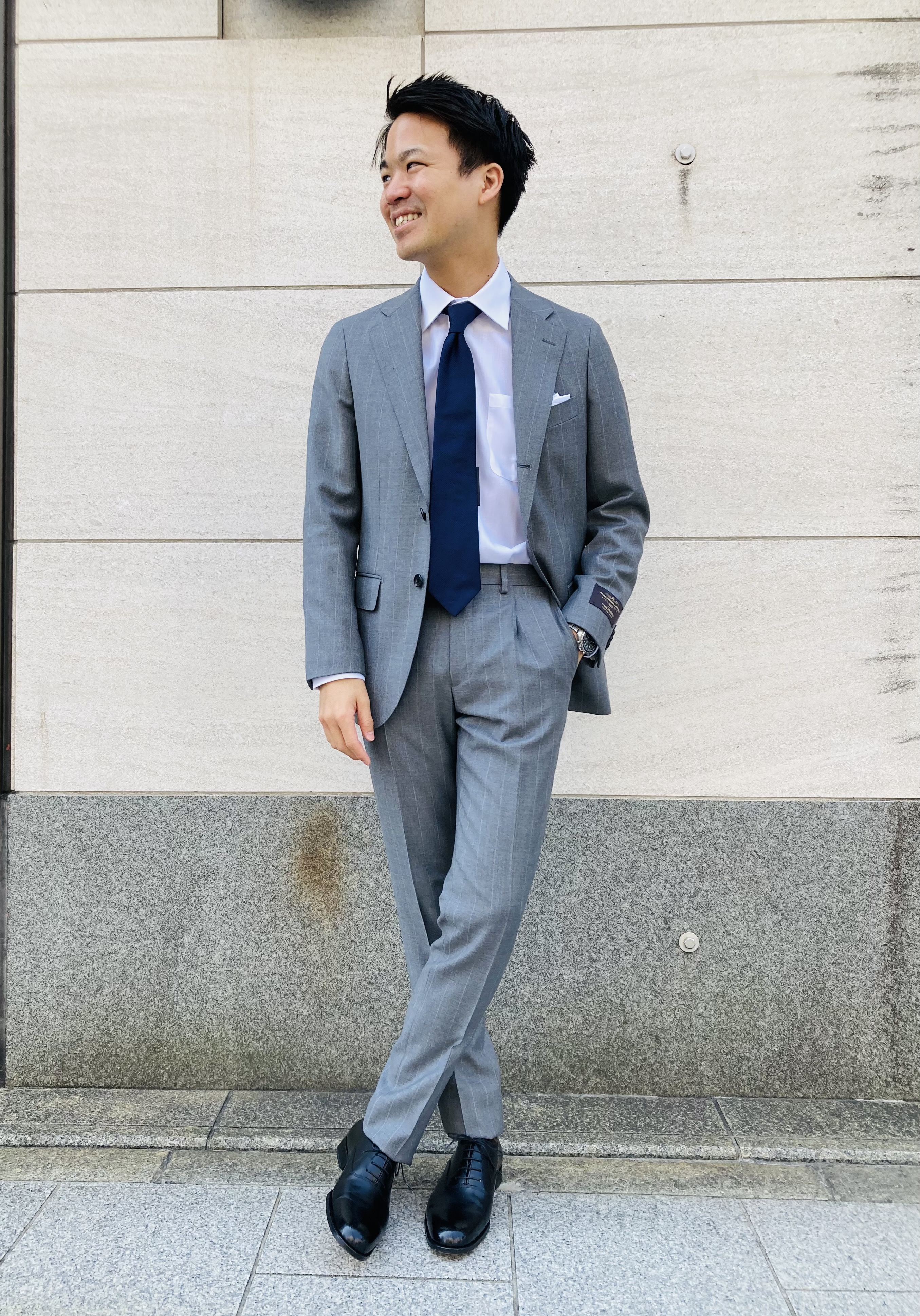 ここは王道の白シャツにネイビー無地タイでシンプルにカッコ良くまとめてみました😎