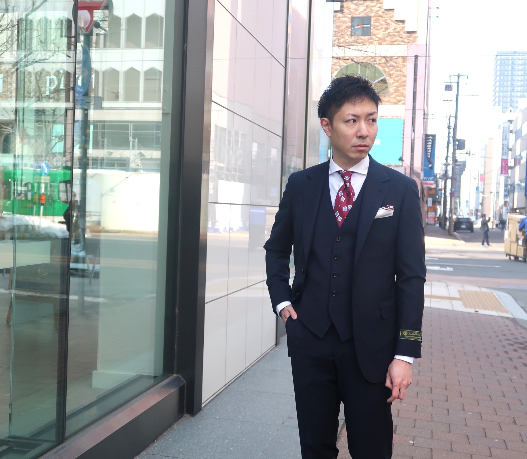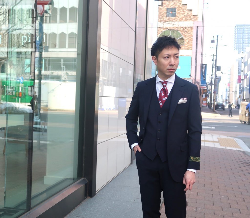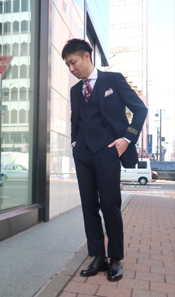 深いネイビースーツに鉄板の白シャツ、ネクタイは