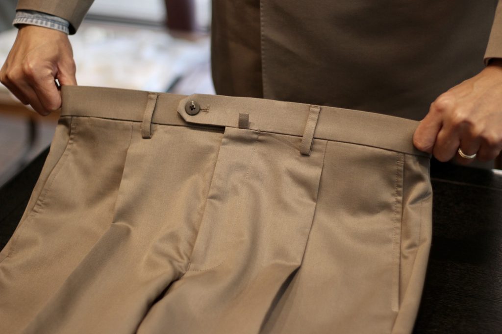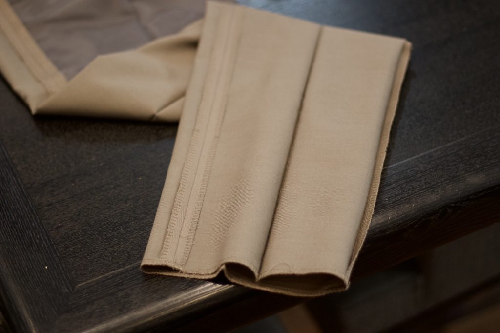 パンツを履いていくと、だんだんとクリースが消えてしまいますが、生地の裏側に特殊な樹脂を塗る事により、アイロンなしで半永久的に購入した時と同じ折り目を保ちます。