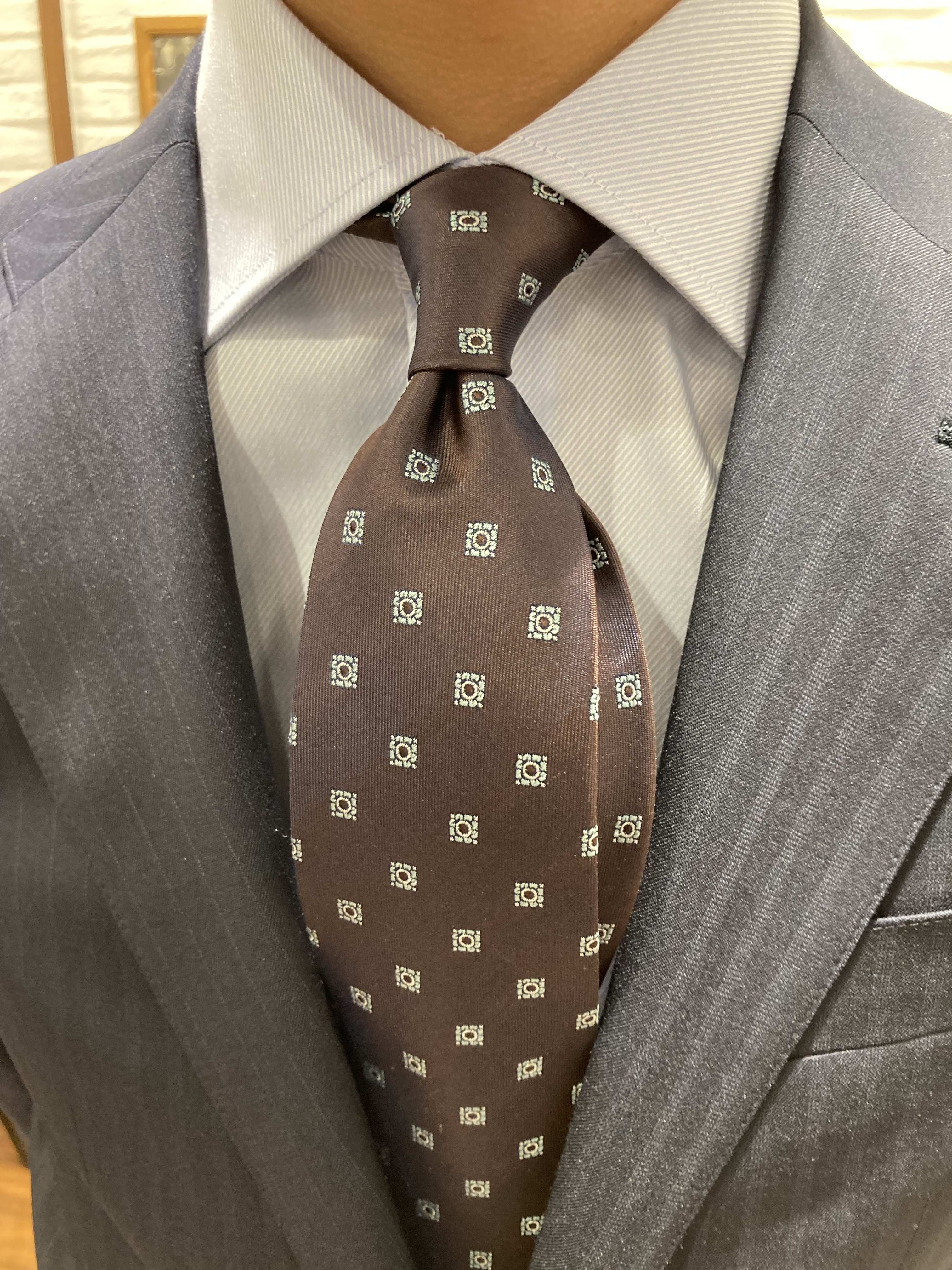 ですのでシャツの色をサックスブルーにネクタイをブラウンで合わせて変化を加えてみました😇