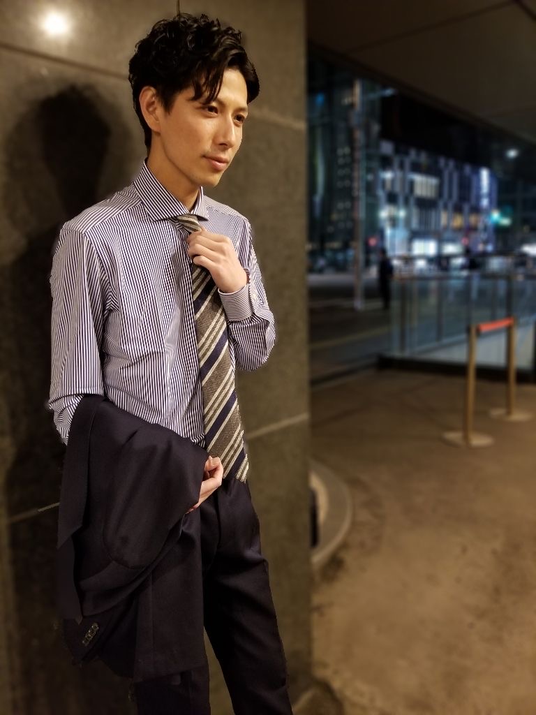 台襟付きなので、タイドアップスタイルも可能。フォーマルな印象を高められビジネスシーンでも重宝します😆😆