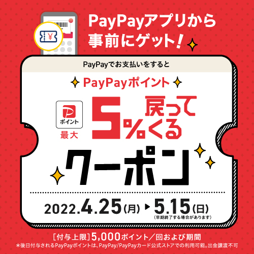 PayPay内で事前にクーポンを取得いただき、お支払いいただくと5%分のPayPayポイントが後日付与されます。