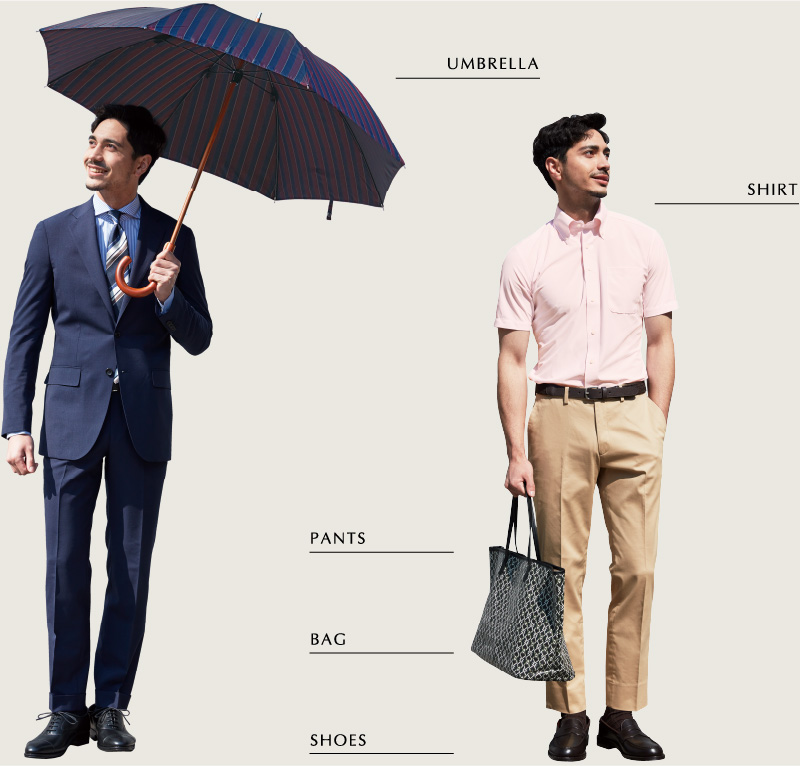 雨をはじき飛ばす撥水加工を施したシャツ・パンツスタイルに、シューズやバック、傘までトータルに展開します。