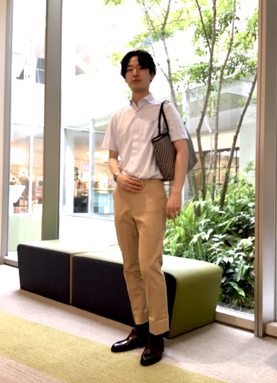 コーディネートはベージュのパンツをアクセントにブルーのシャツに合わせて清涼感のあるコーディネートです