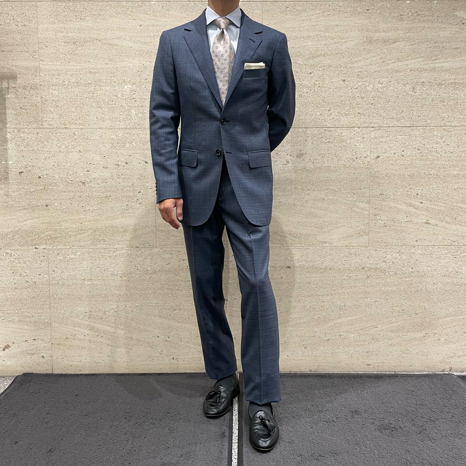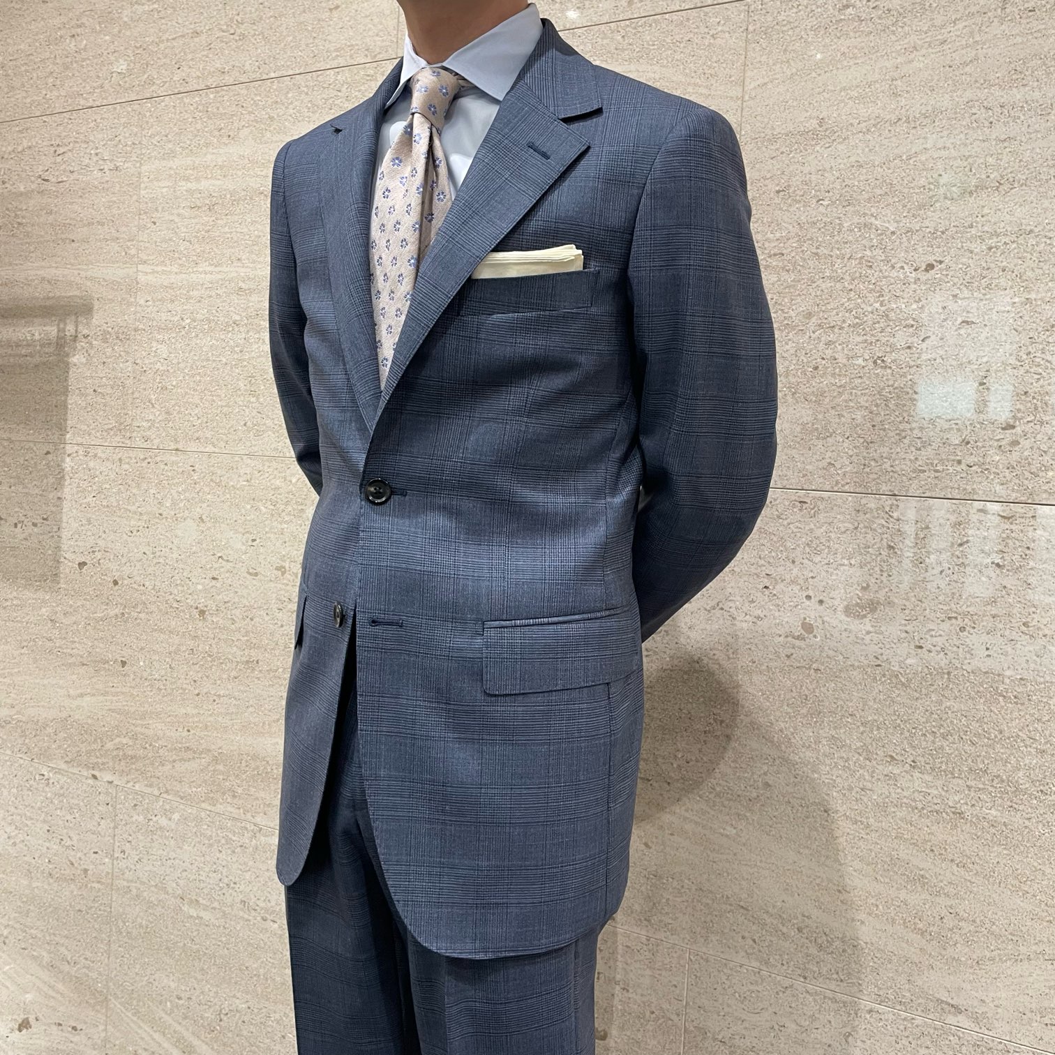 ブルーグレーの絶妙な色味とチェック柄がオシャレな印象のスーツです👍