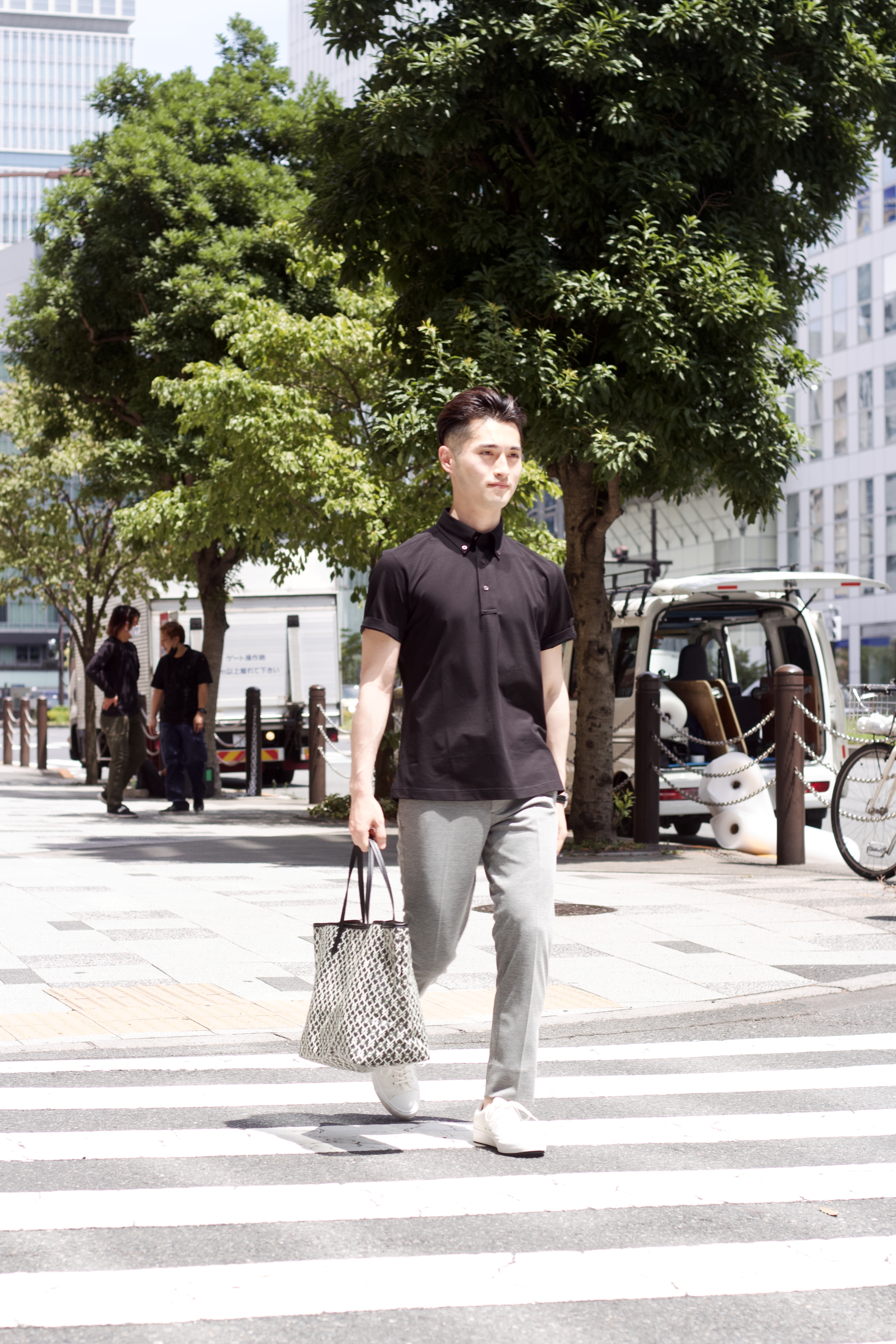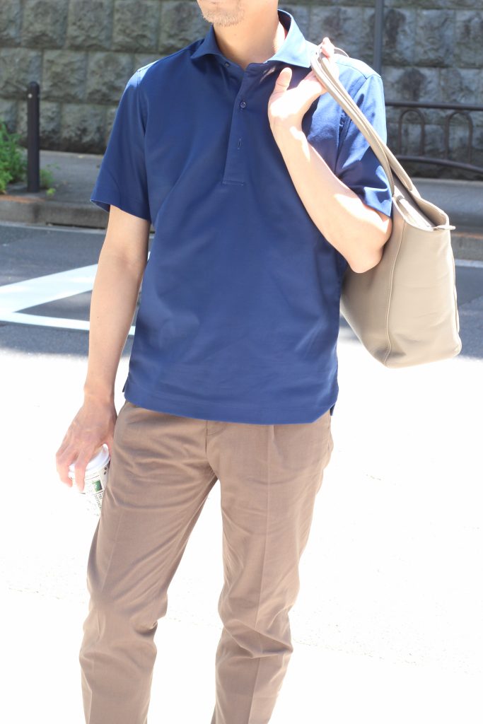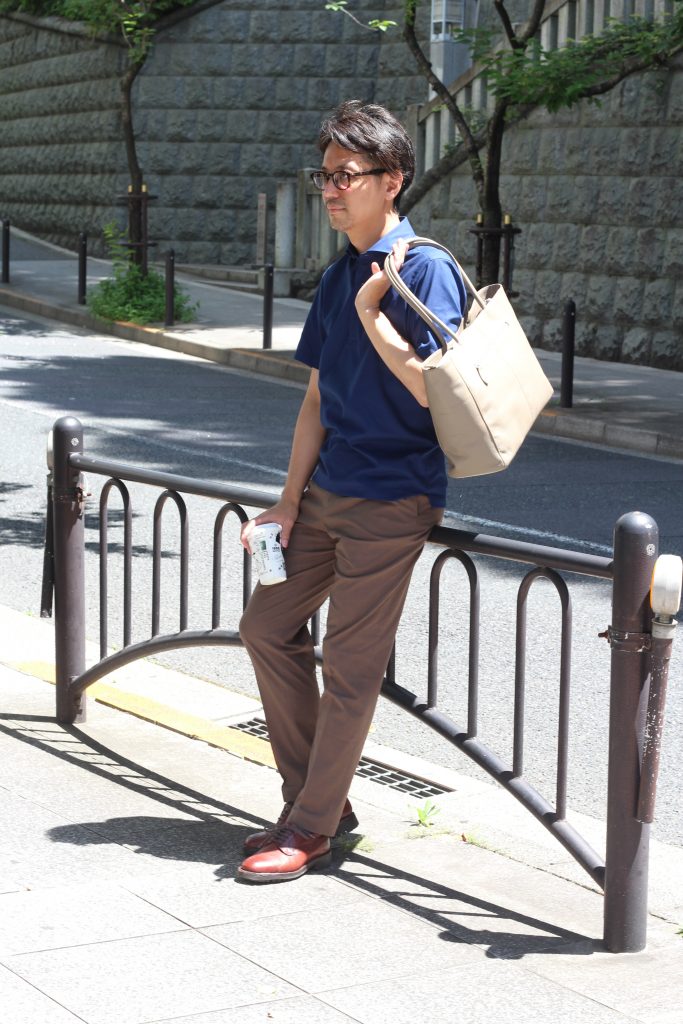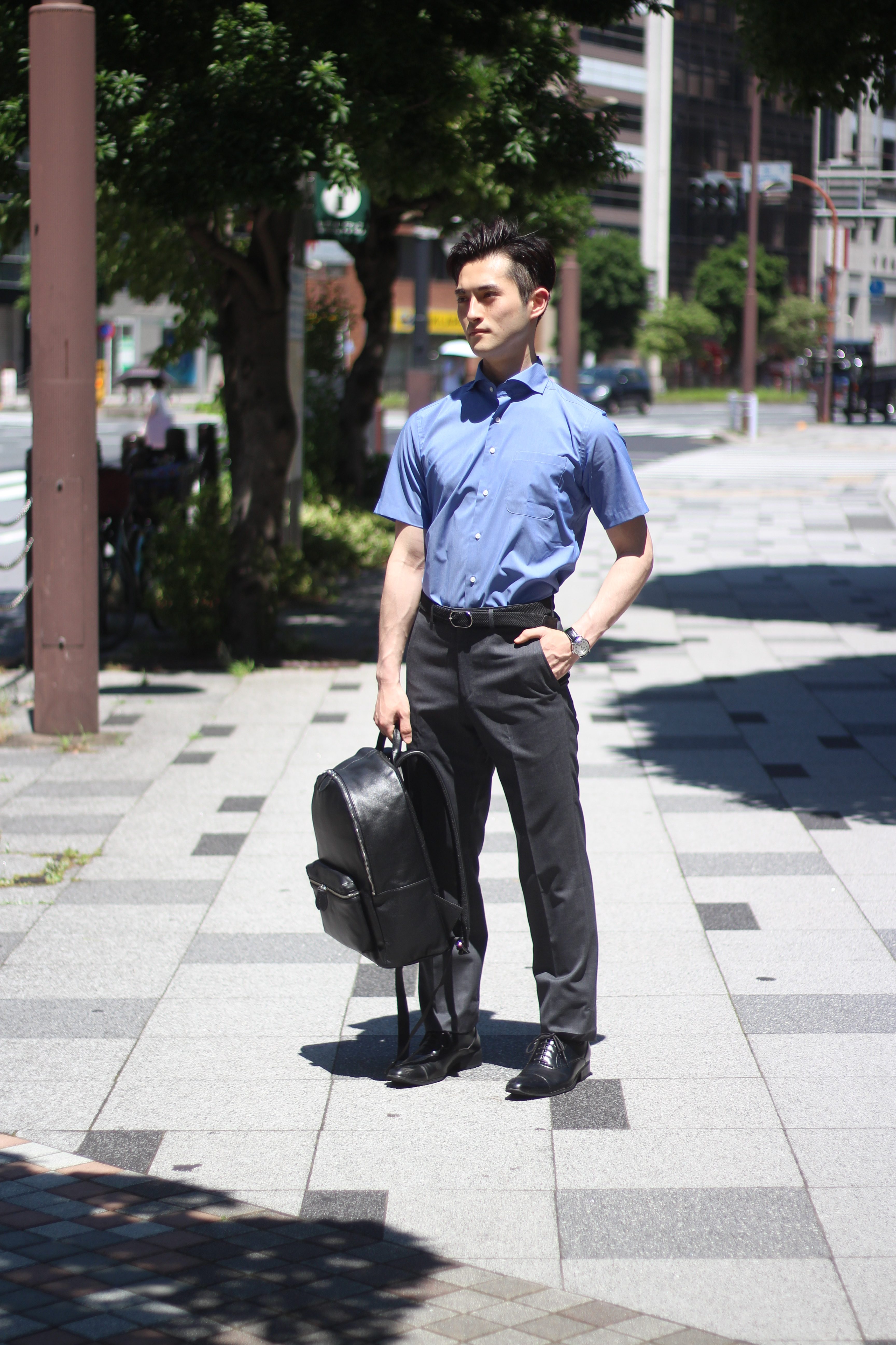 夏に向けての色選びは、少しシックな印象もビジネスシーンには必要です。チャコールグレーのパンツにロイヤルブルーの半袖シャツでカッチリ目に合わせれば、軽く見え過ぎない装いになります。バッグやベルトもシックな色合いを選んで、トータルバランスを意識したスタイリングにしました。