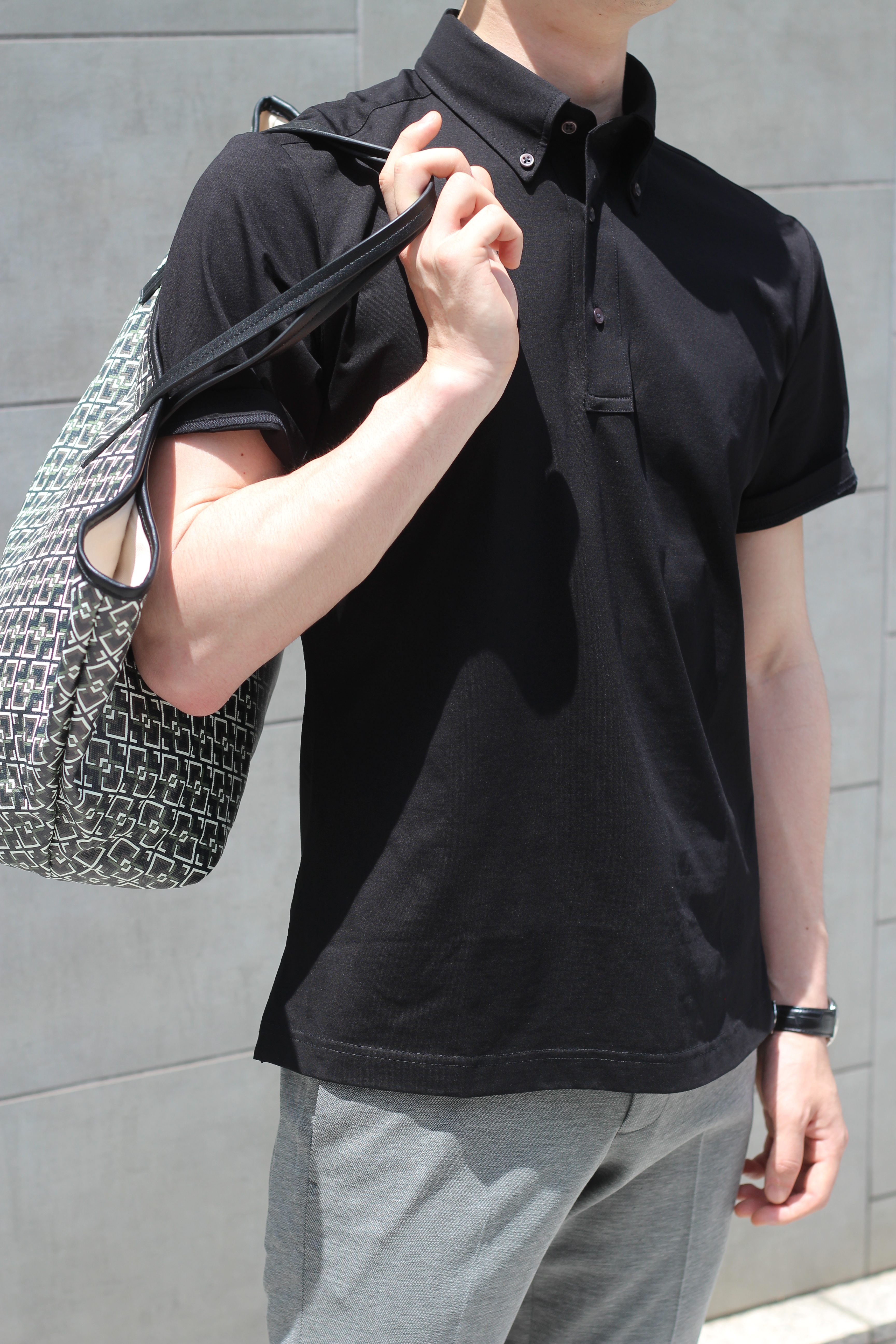 モノトーンを涼しげに見せるには、色目の強弱をハッキリしてみてはいかがでしょうか? ブラックのトップスにライトグレーのボトムスは、王道でありながら他と差が付くコーディネート。 特に全体が締まって見えるので、社外への訪問もラフ過ぎず好印象な装いです