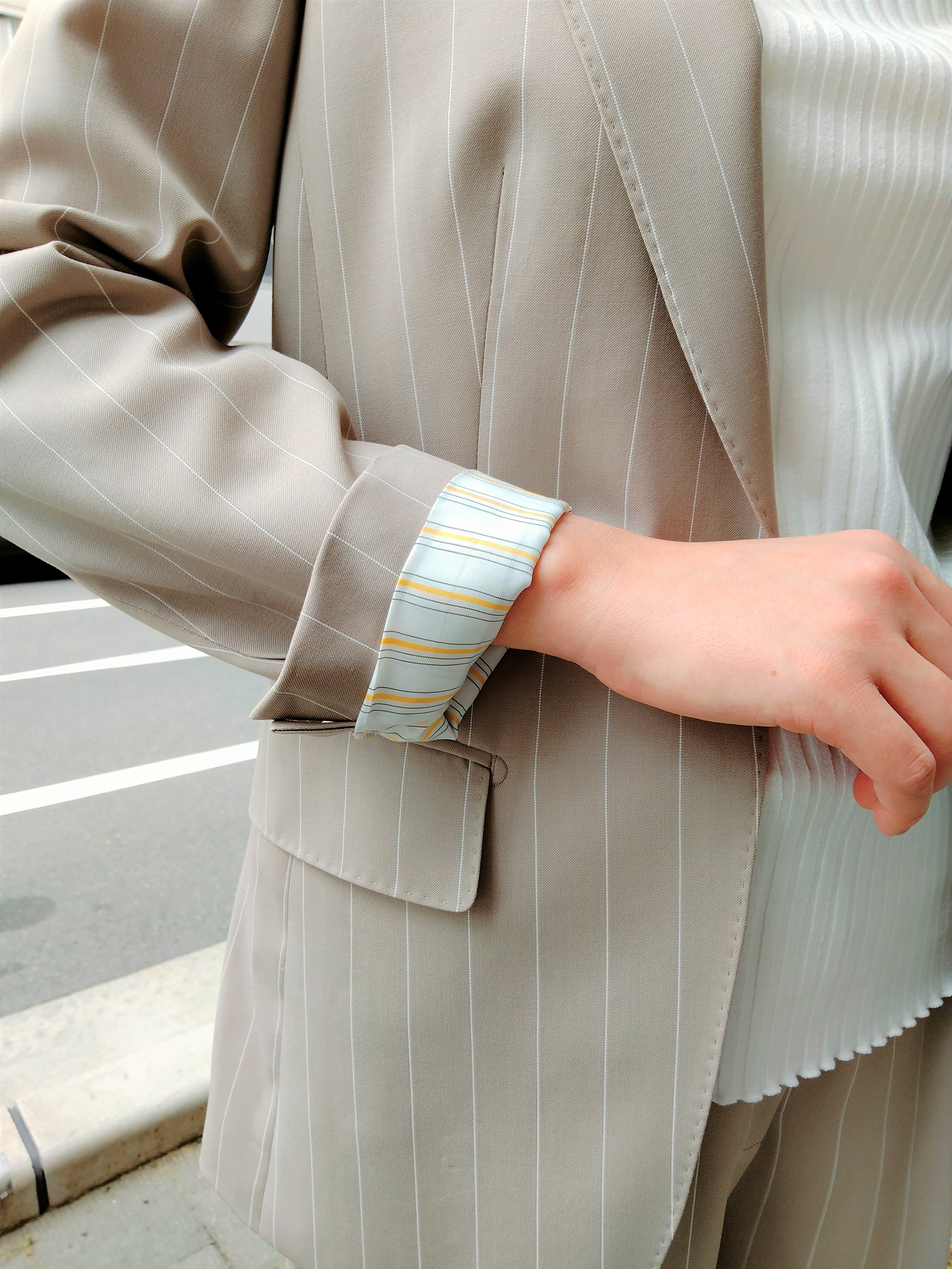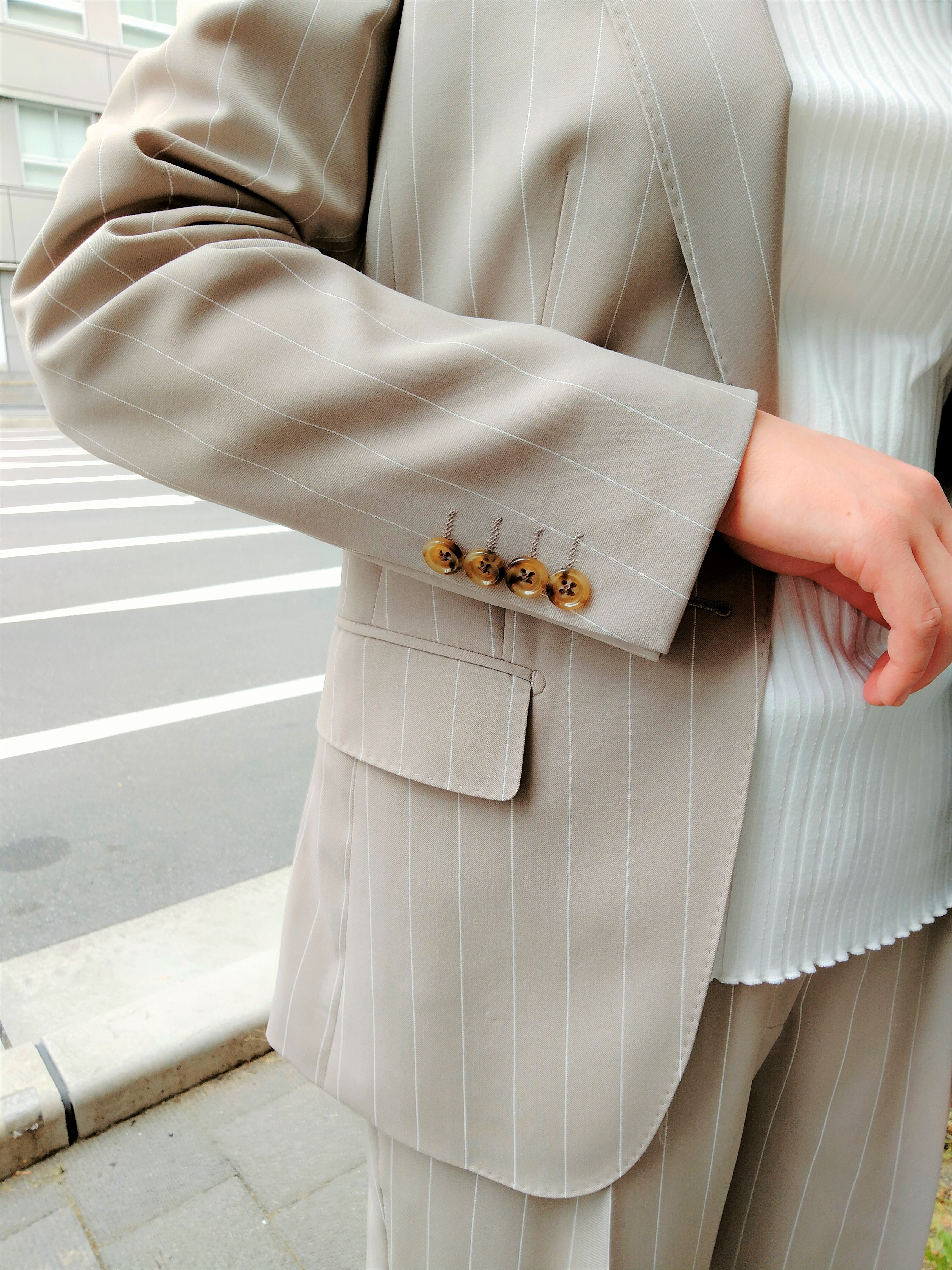 パッと目を惹く華やかなベージュのスーツ✨