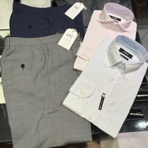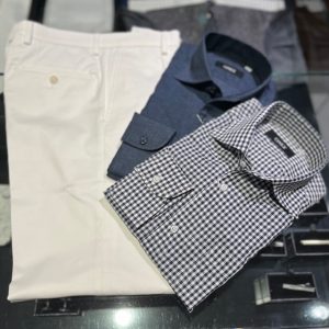 ウールスラックスと空羽生地のシャツを組み合わせた、定番クールビズスタイルです。