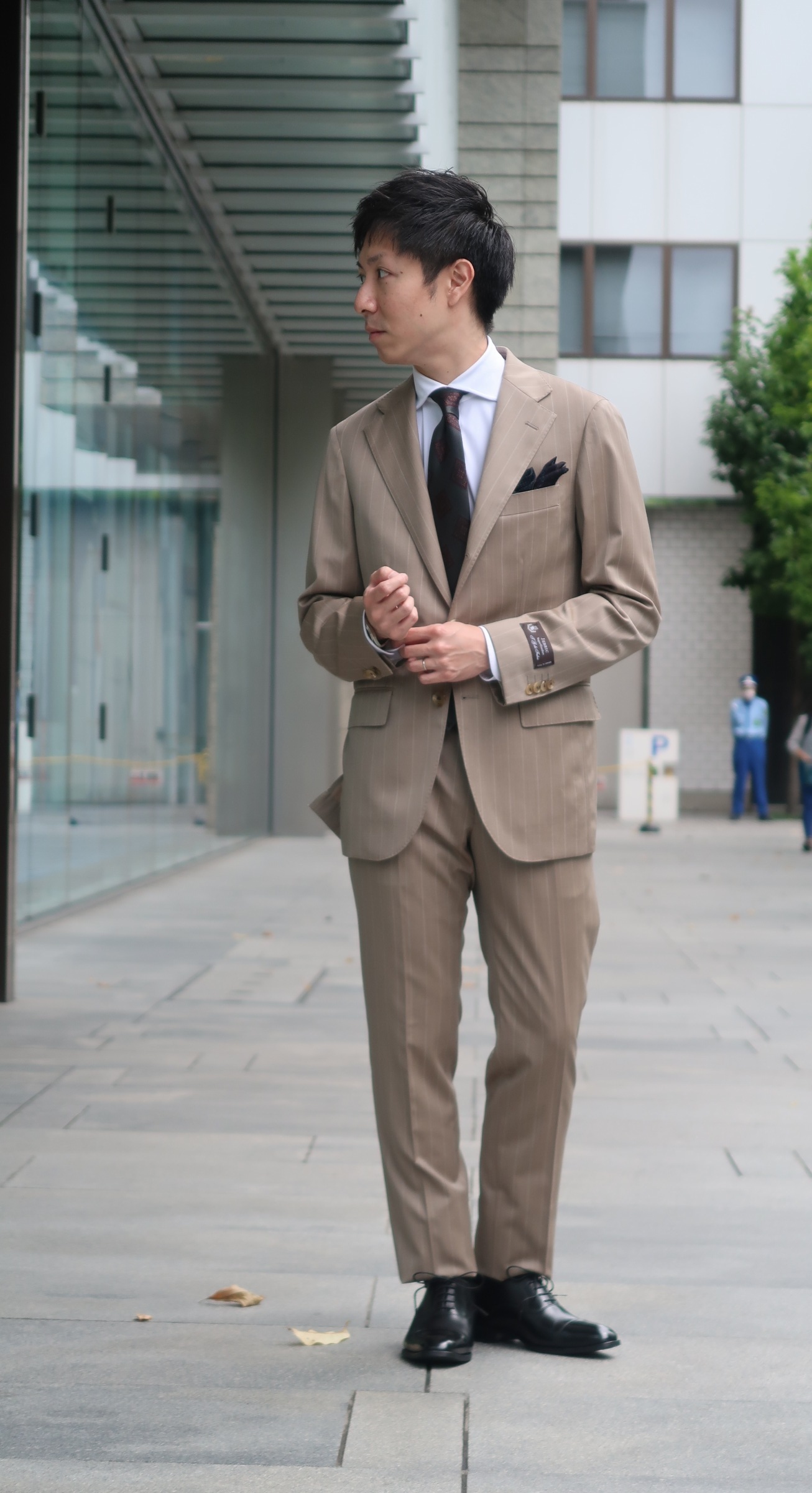 コーディネートは淡いブラウンのネクタイで抜け感を演出✨