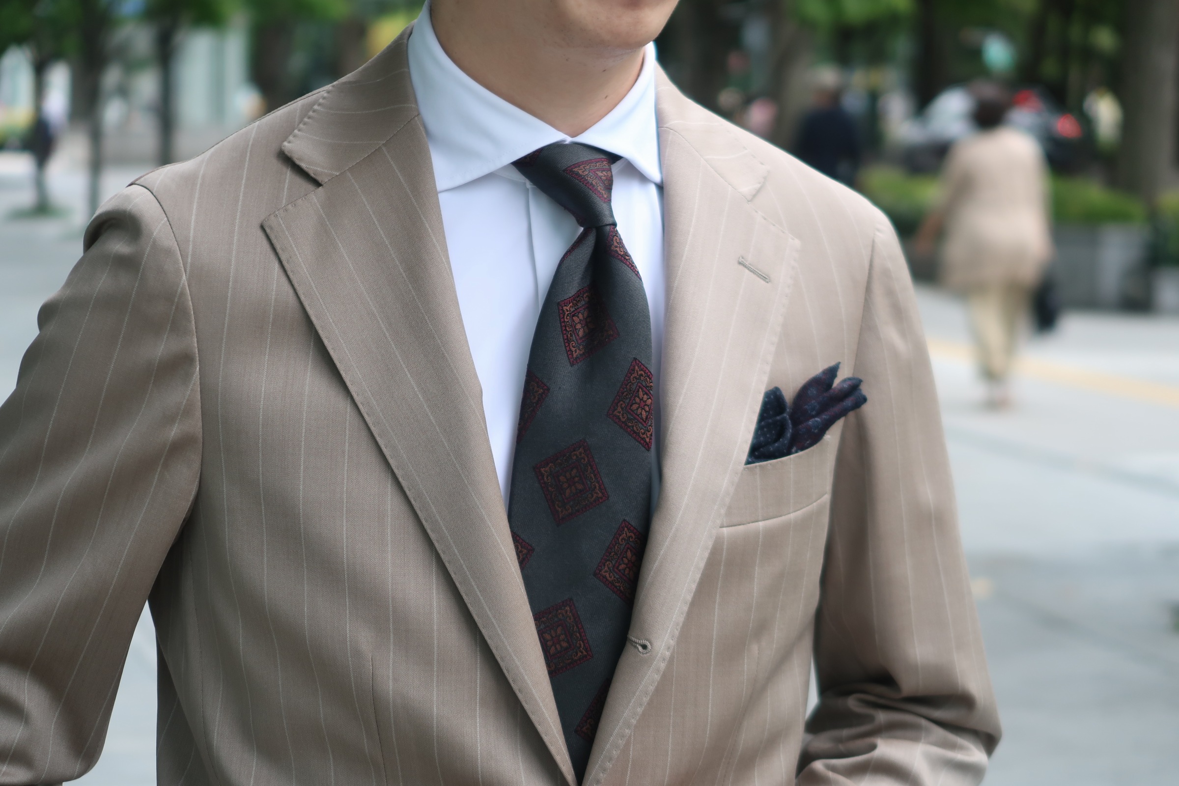 柔らかな雰囲気のベージュに深いグリーンのネクタイを合わせ、