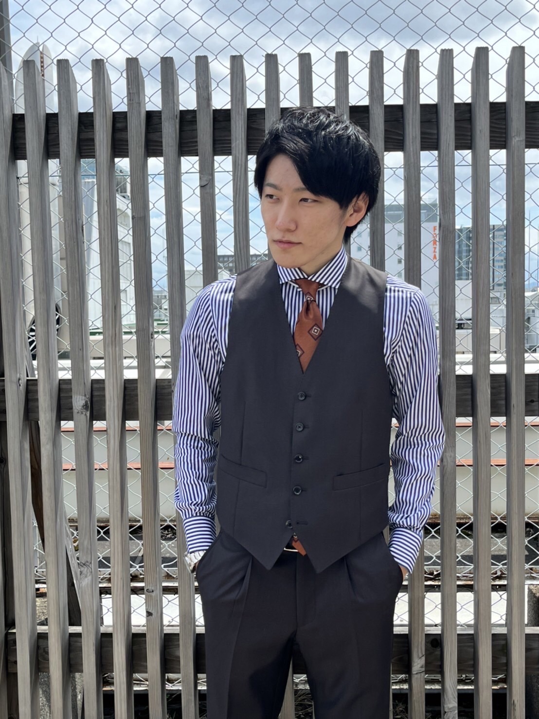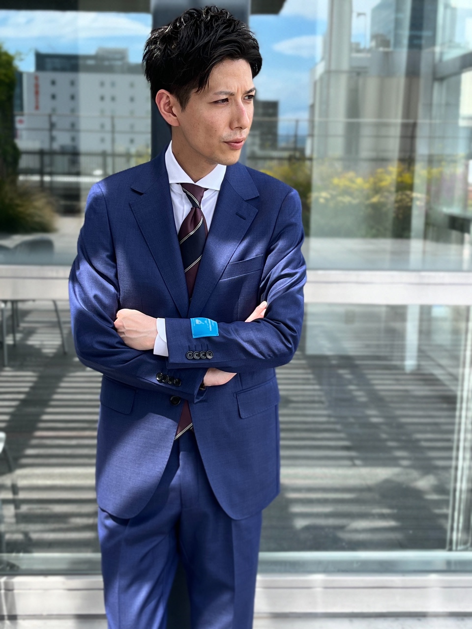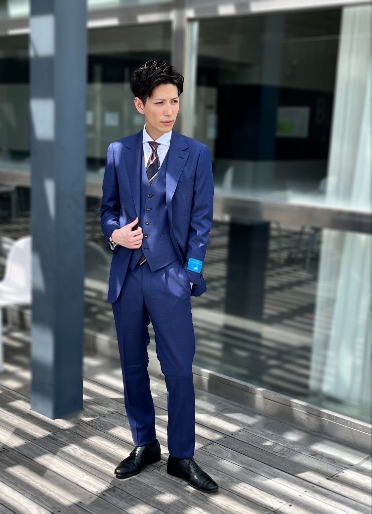 少し「くすみ感」のあるライトブルーのスーツは、落ち着き感もあり華やかさの中にも知的な印象をプラスにでき、「個性が出過ぎるのは苦手だ」という方にもチャレンジしやすいスーツになっています💁♂️✨
