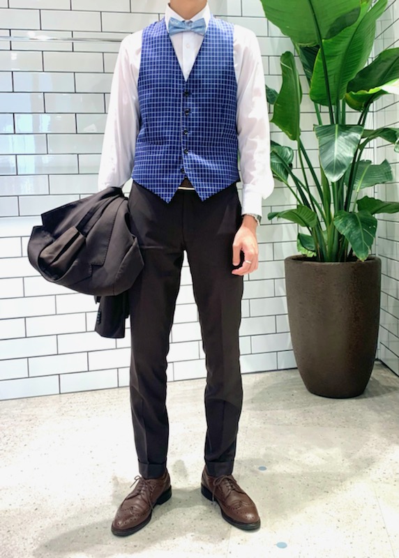 手持ちのビジネススーツをパーティー仕様にしたい方には、このくらいアクセントになるベストがオススメです👍