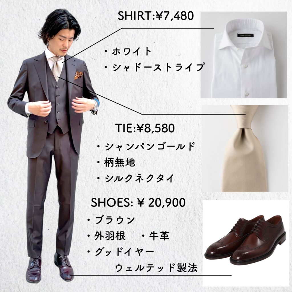 今回は、白シャツに艶のあるシャンパンゴールドのタイを合わせ、