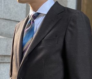今回着用しているのは、イタリアの生地メーカードラゴ社の「スウィング」で仕立てたブラウンスーツです!