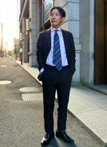 着用モデルをしていただいている札幌エスタ店スタッフの花田さんもオススメの新作スーツで、