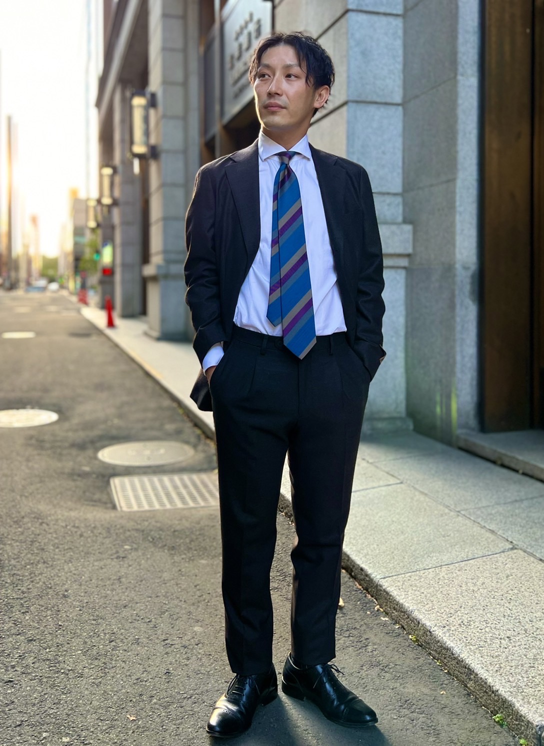 コーディネートは、シンプルなホワイトのシャツにこっくりとしたウール混ストライプのブルータイで大人の秋の装いを演出してみました👔🍂