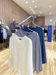 ベージュ、ネイビーは、バイカラーでデザイン性を出した新作ブラウスとなっております!