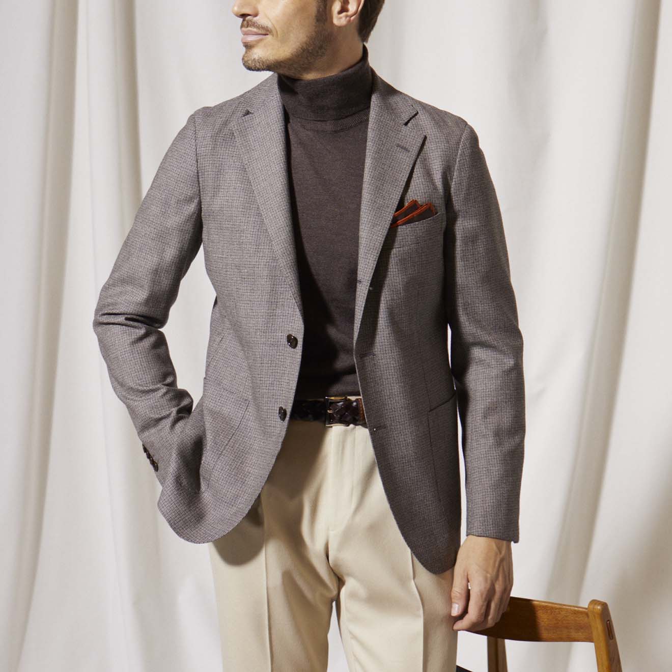 定番のタートルは、ジャケパンスタイルにはもちろんスーツスタイルにも相性抜群!