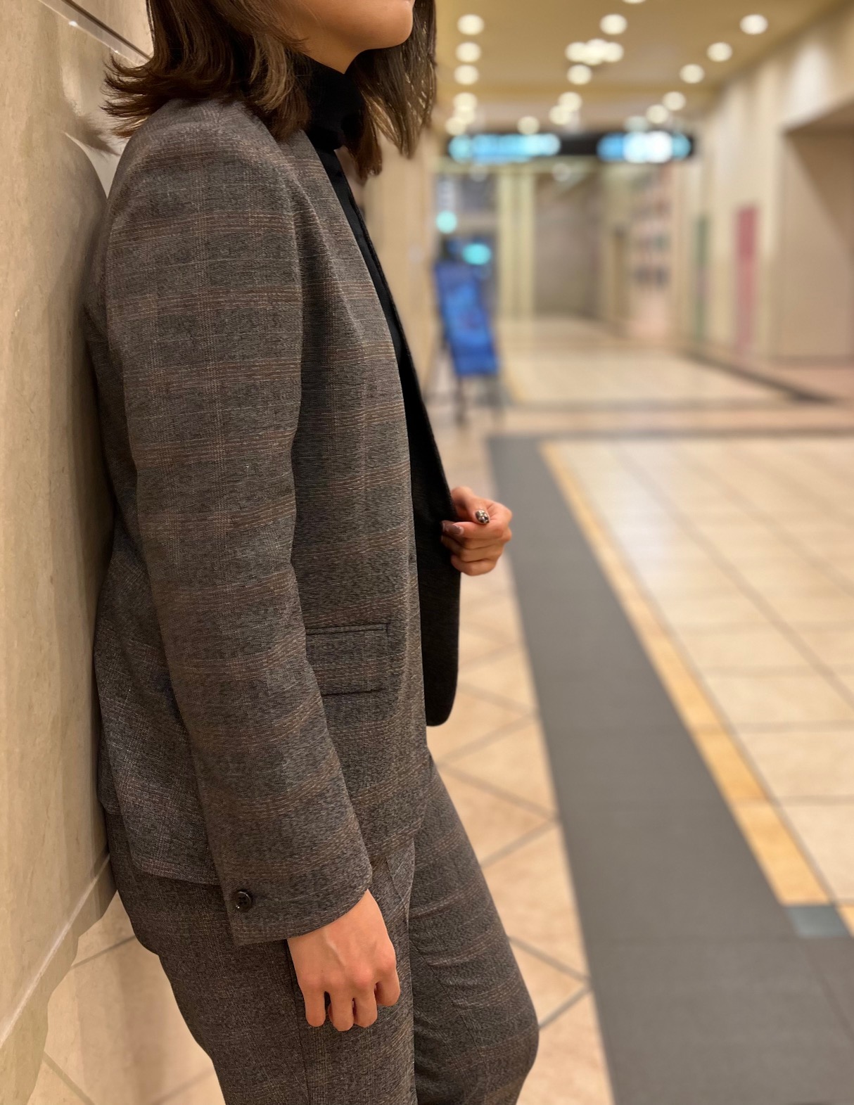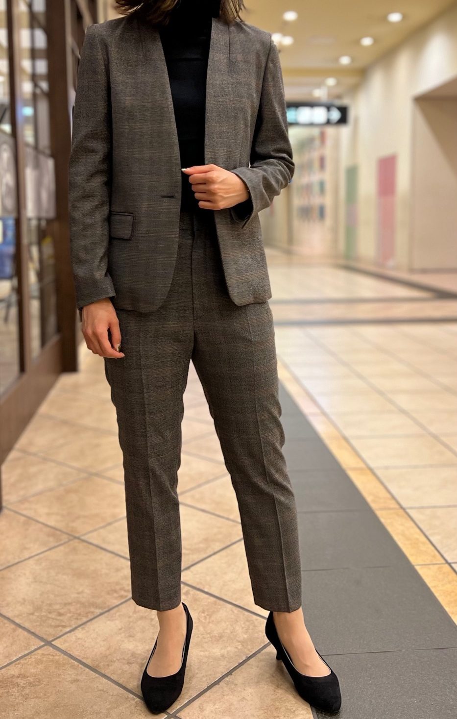秋冬らしいグレーとブラウンのチェック柄がオシャレなノーカラースーツ😆✨