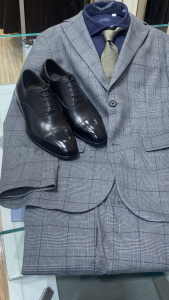ワインレッドのストライプシャツにグレーのネクタイをアクセントにしていただくことでお洒落な着こなしになります。