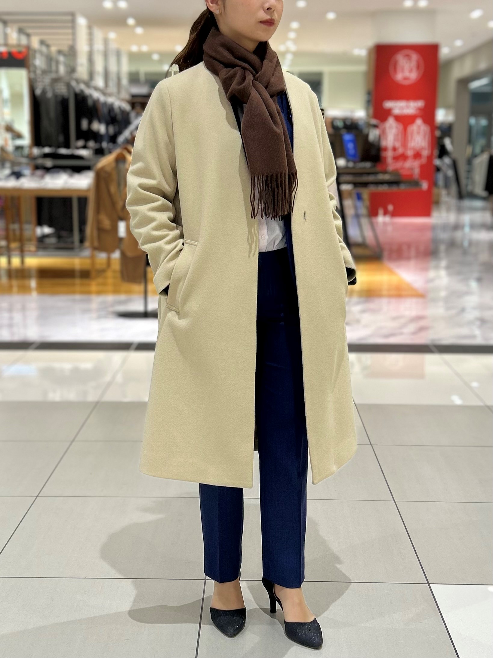 ノーカラーコートは首回りがスッキリしているのでマフラーやタートルネックのアイテムを合わせるのがオススメです!(^^♪