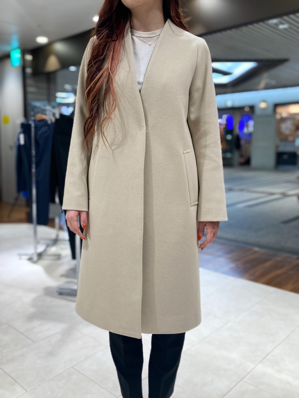 ノーカラータイプのロングコートです。