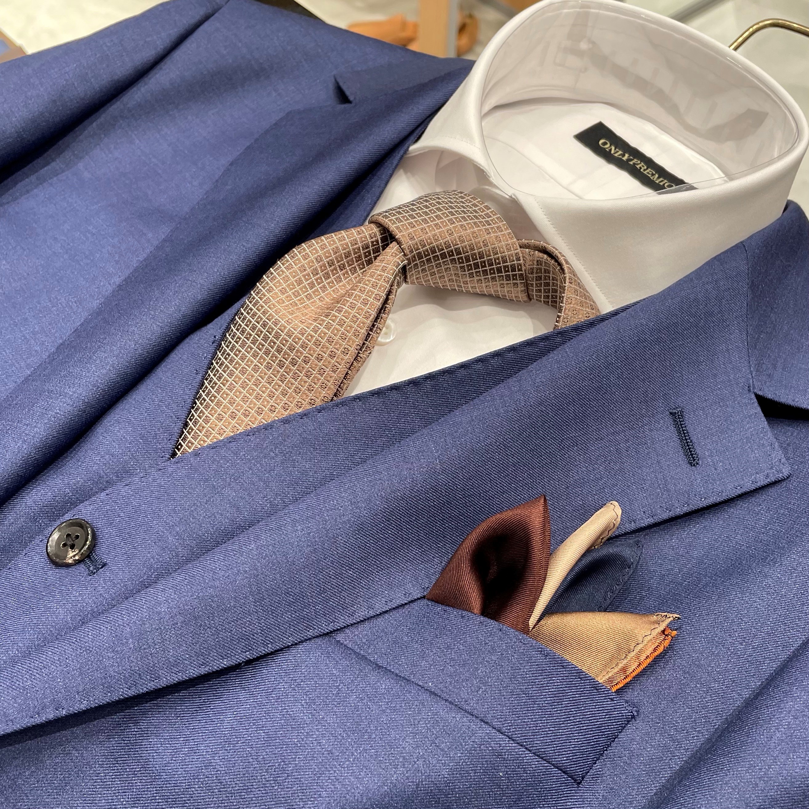 王道の赤でもなく青でもなく、あえて大人っぽいベージュのネクタイを合わせてみました。