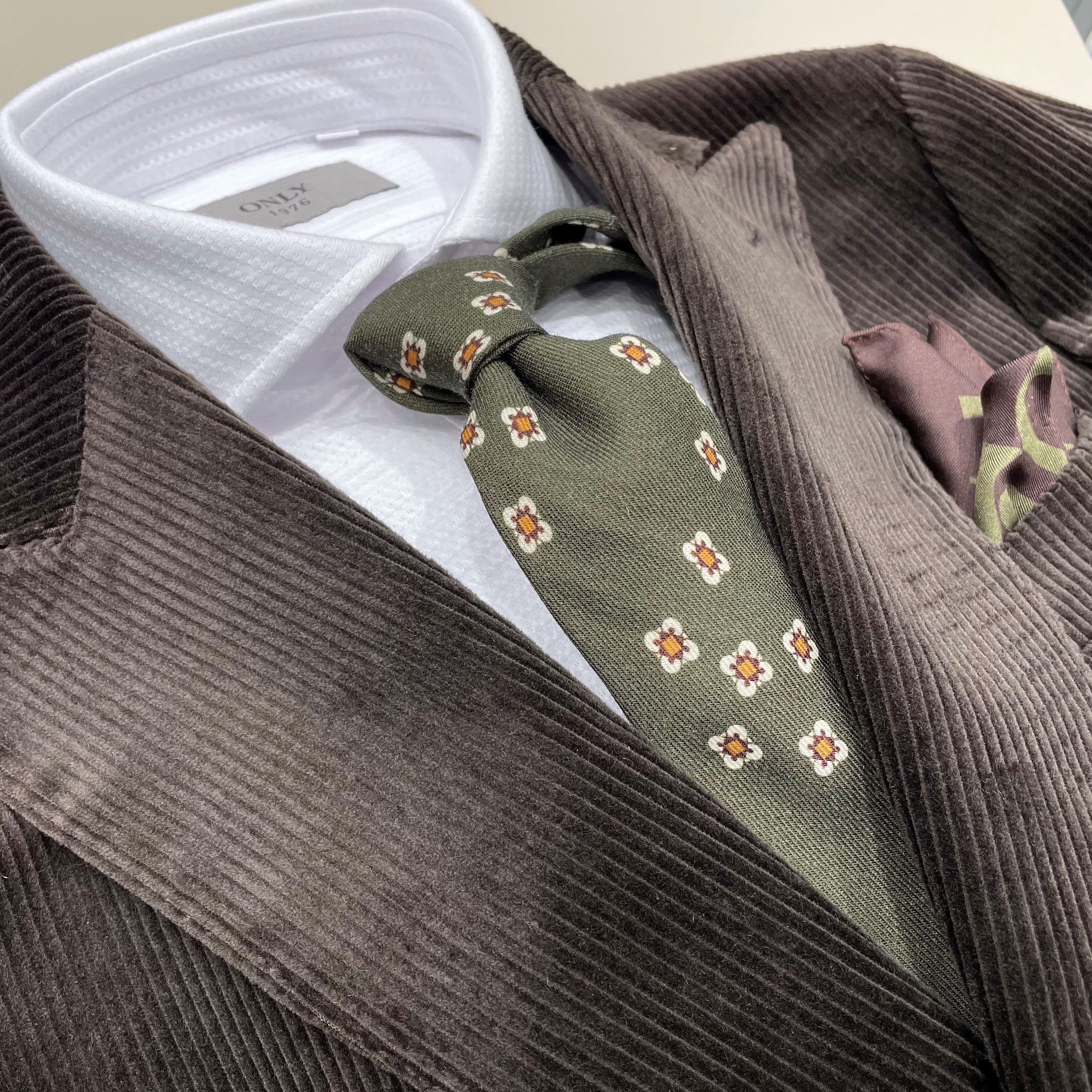 そこに大人気グリーンの小紋柄のネクタイを合わせるという、、、