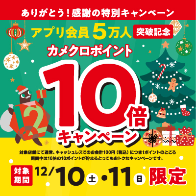カメクロアプリ会員登録されているお客様は対象店舗でのキャッシュレスでのお買物税込100円につき