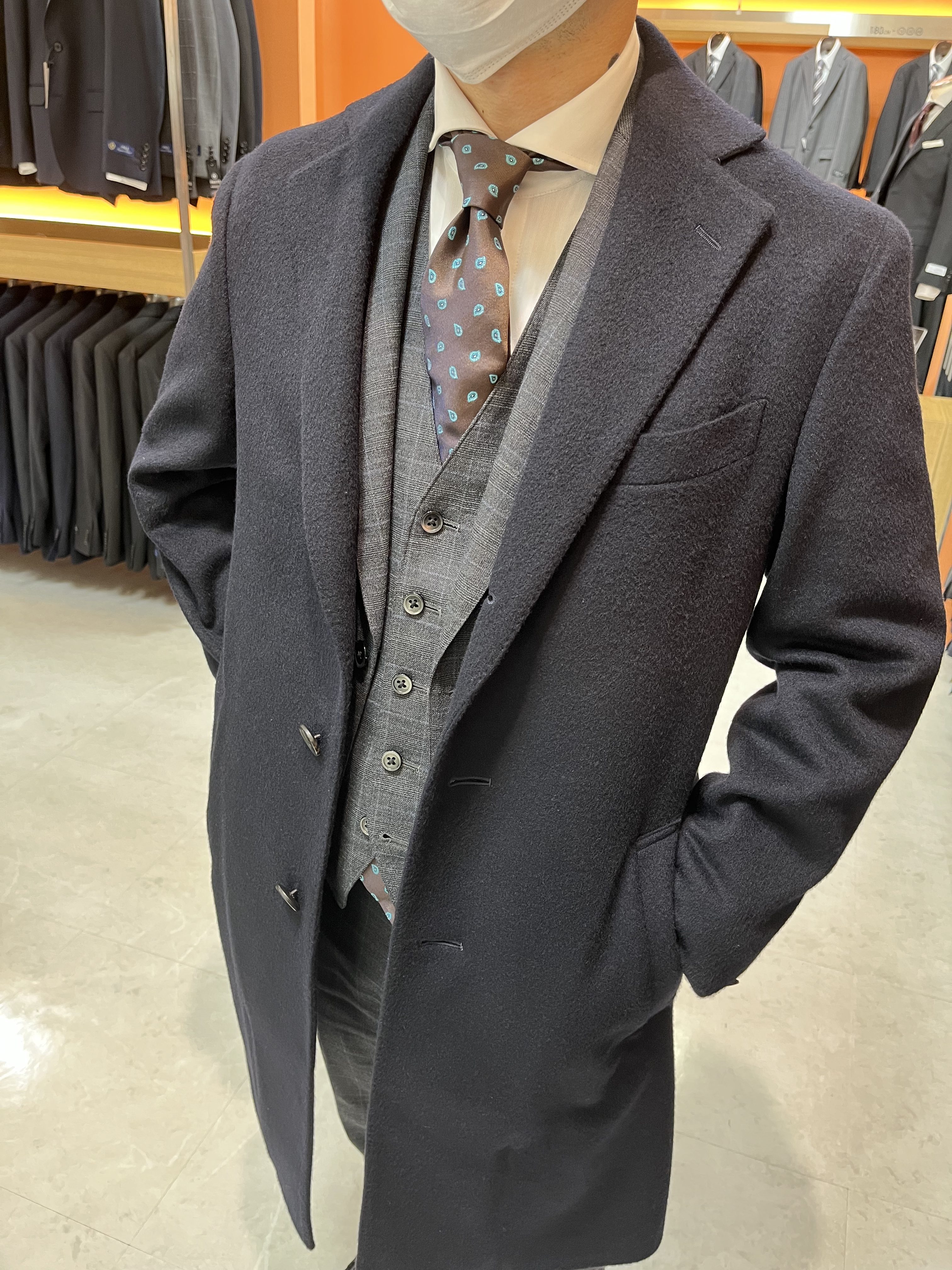 コートの色はどの色のスーツにも合わせやすいネイビーにし、ネクタイは今年のトレンドであるブラウンを合わせました✌️