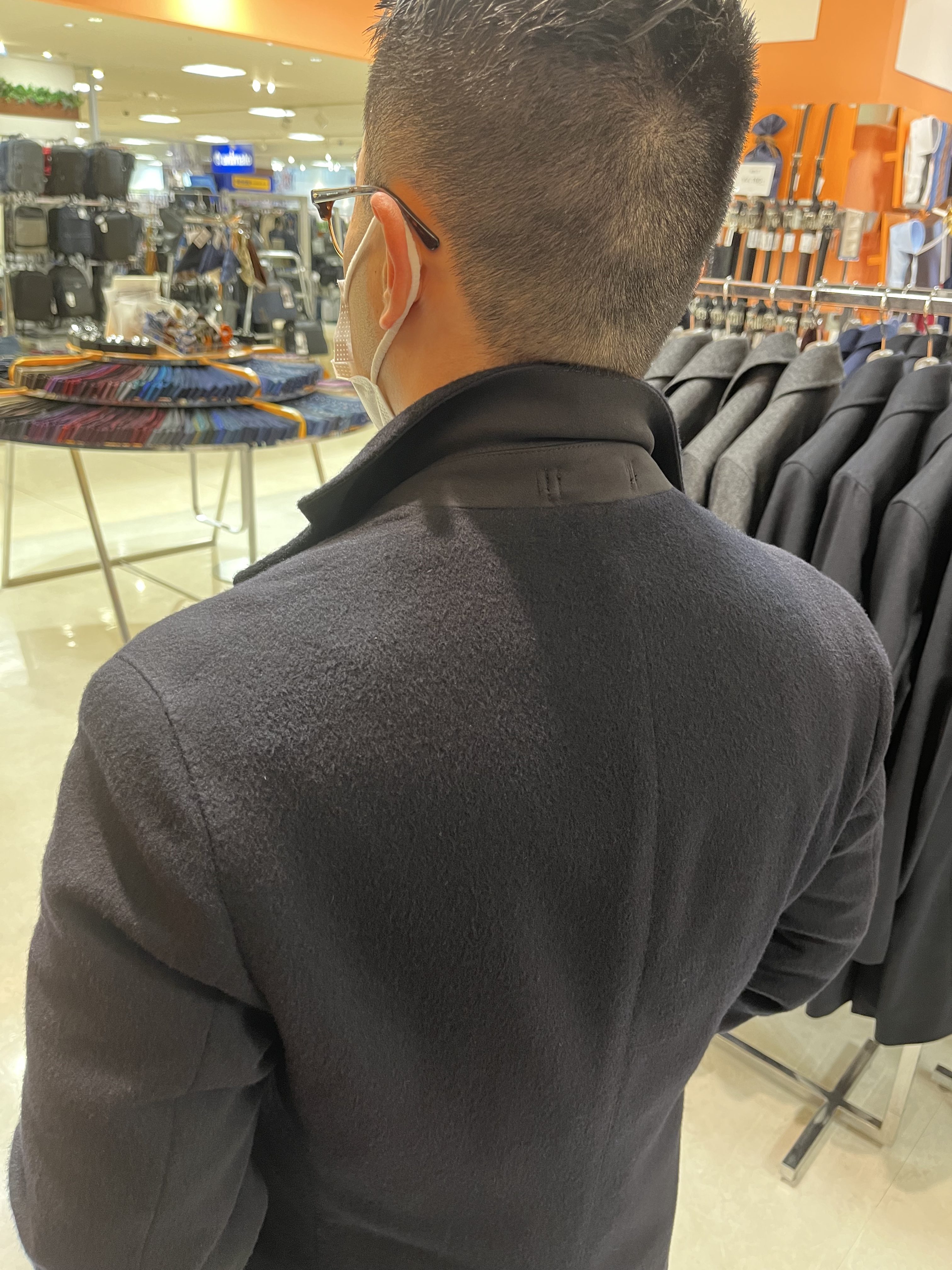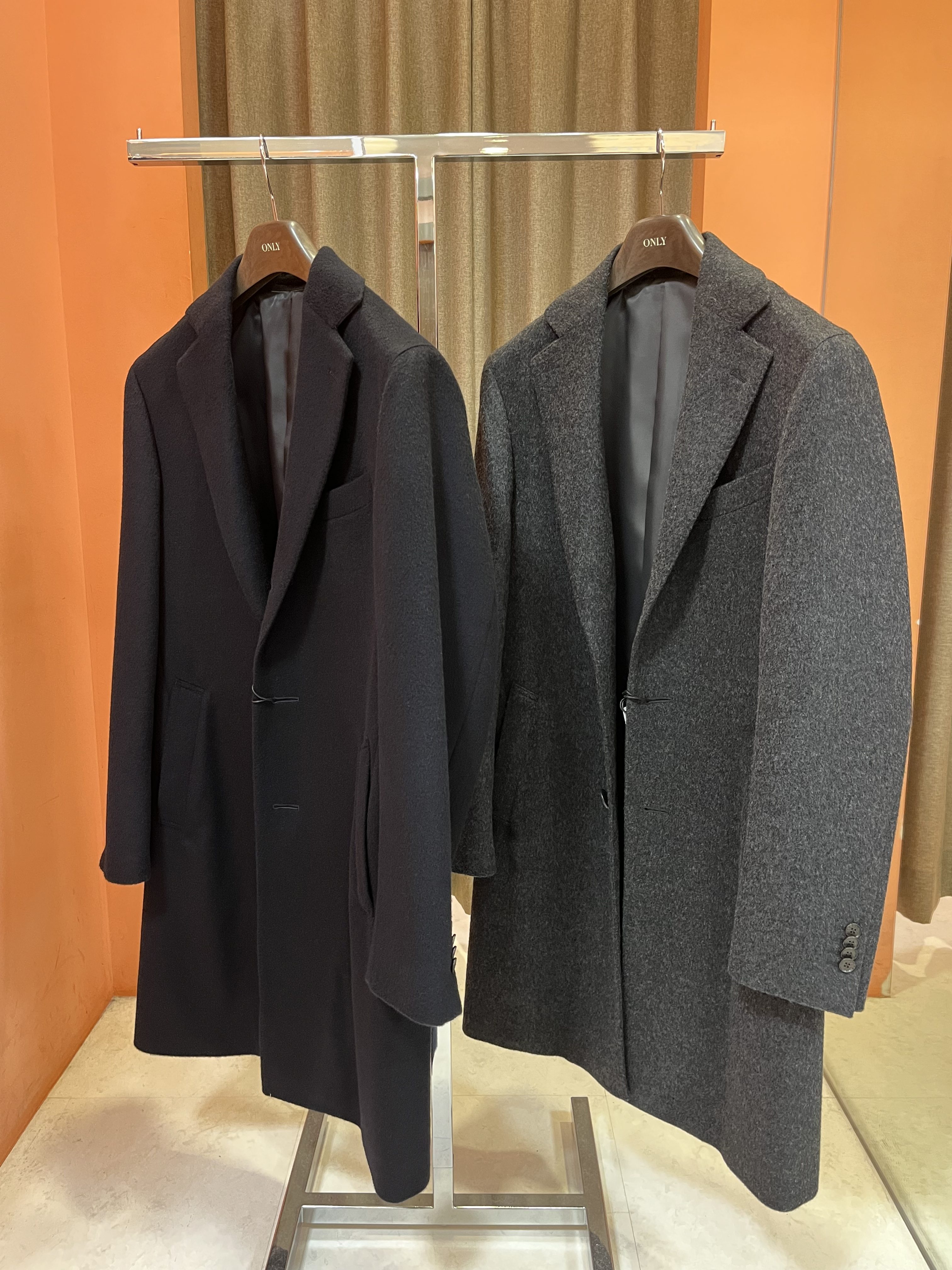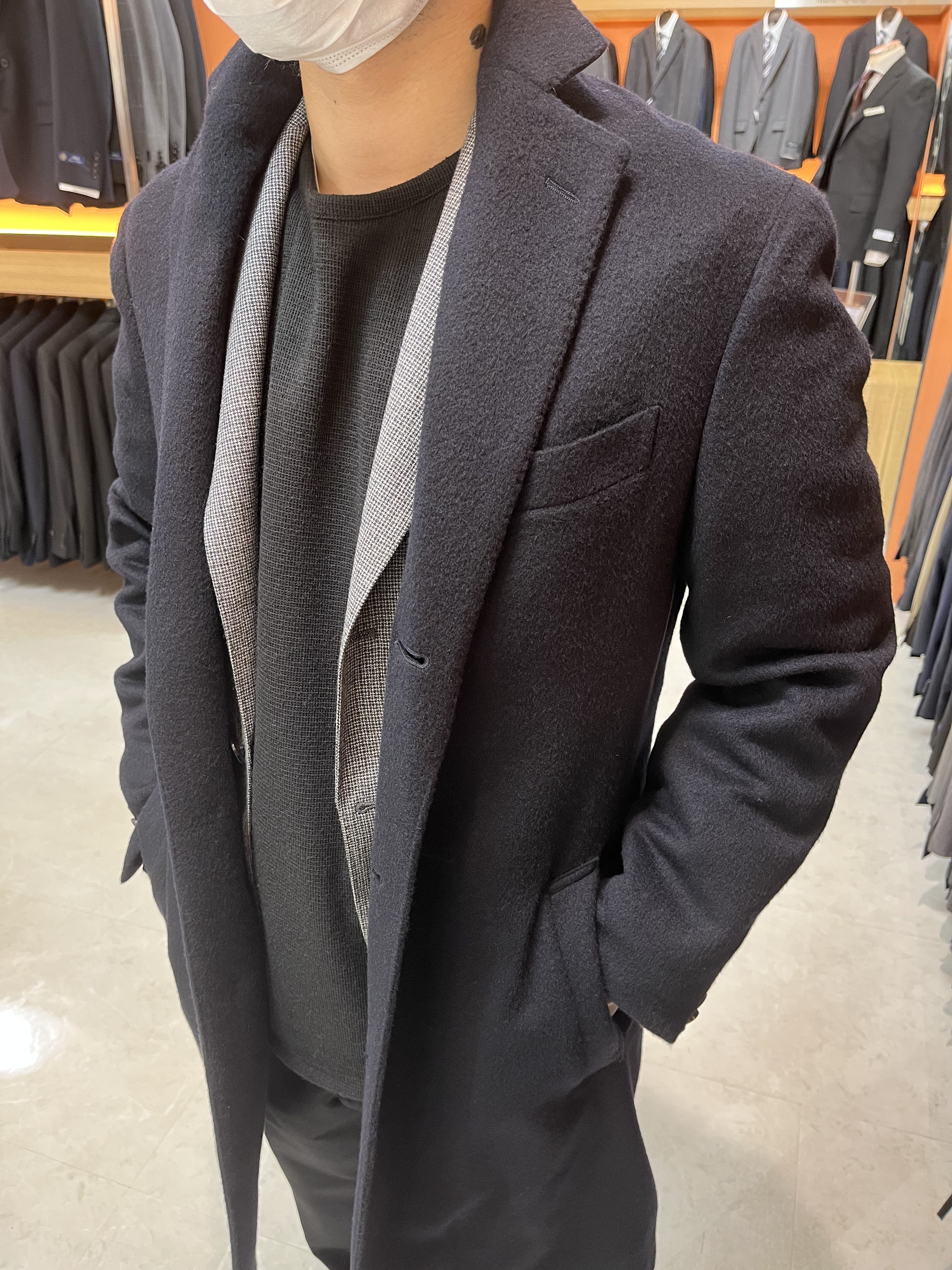 シングルチェスターコートですがスリムにしすぎないようにし、着丈もやや短めにしている今風のコートです‼️‼️