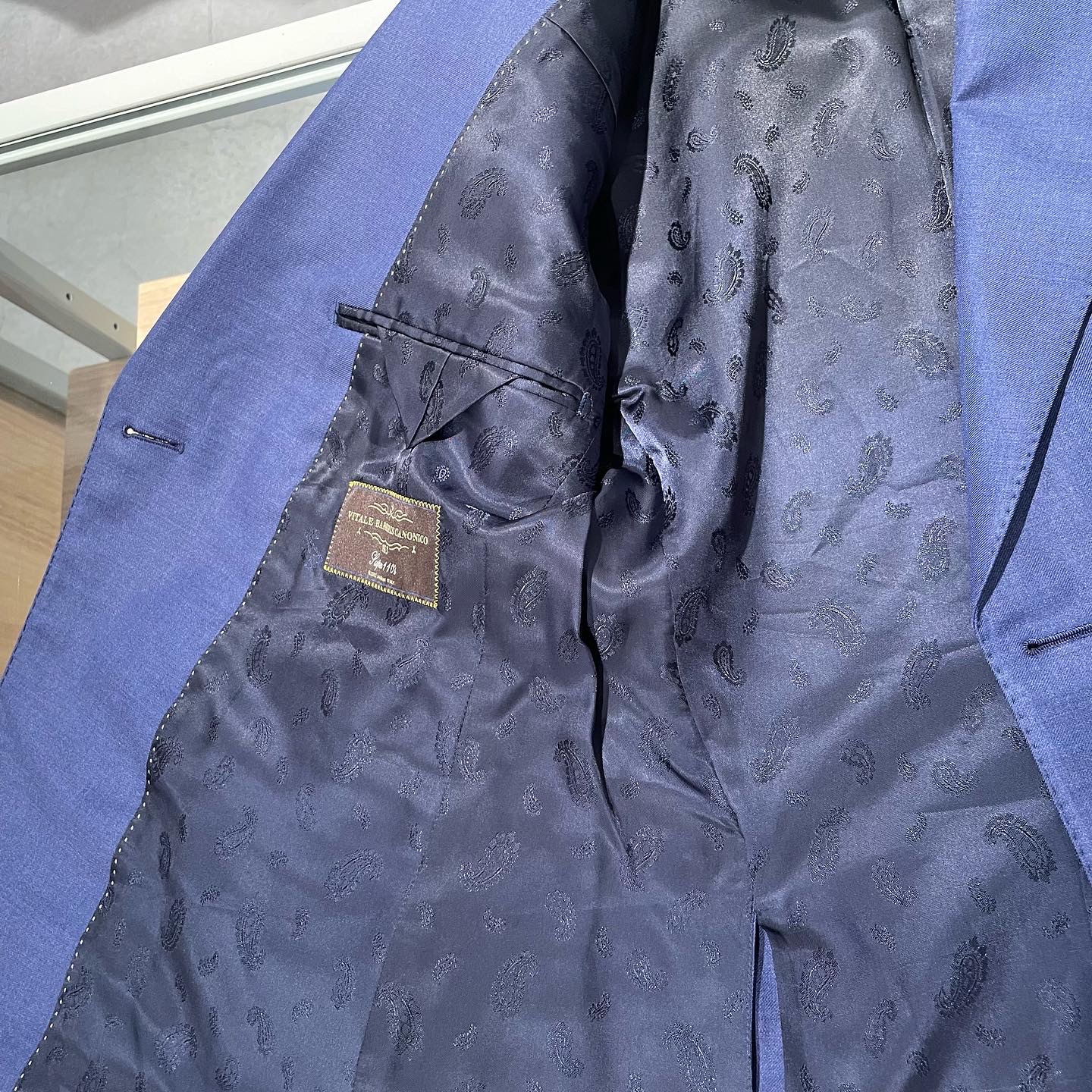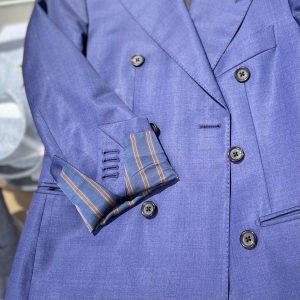 スタッフ着用の華やかなブルーの生地はCANONICO社の光沢感が特徴のもの。