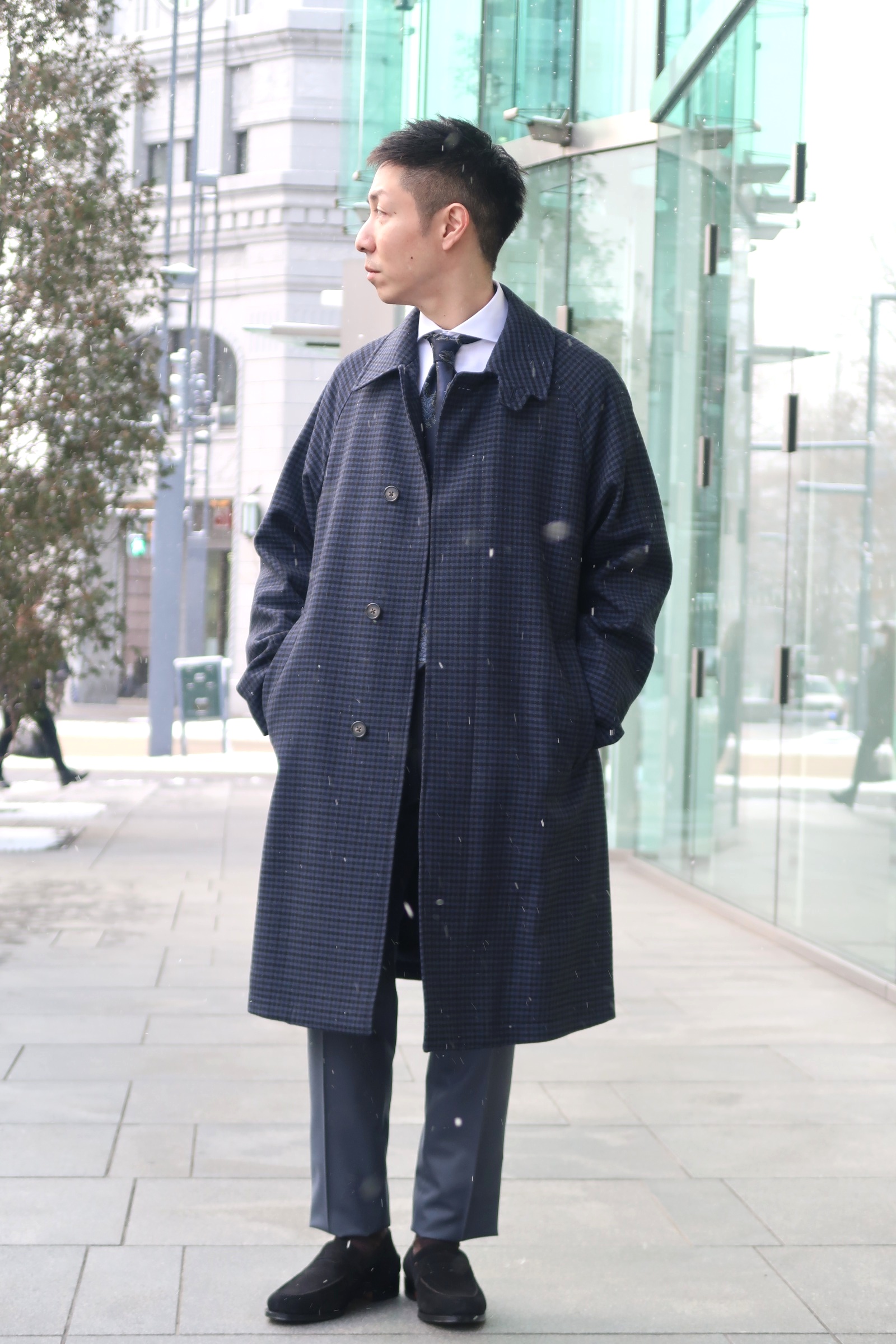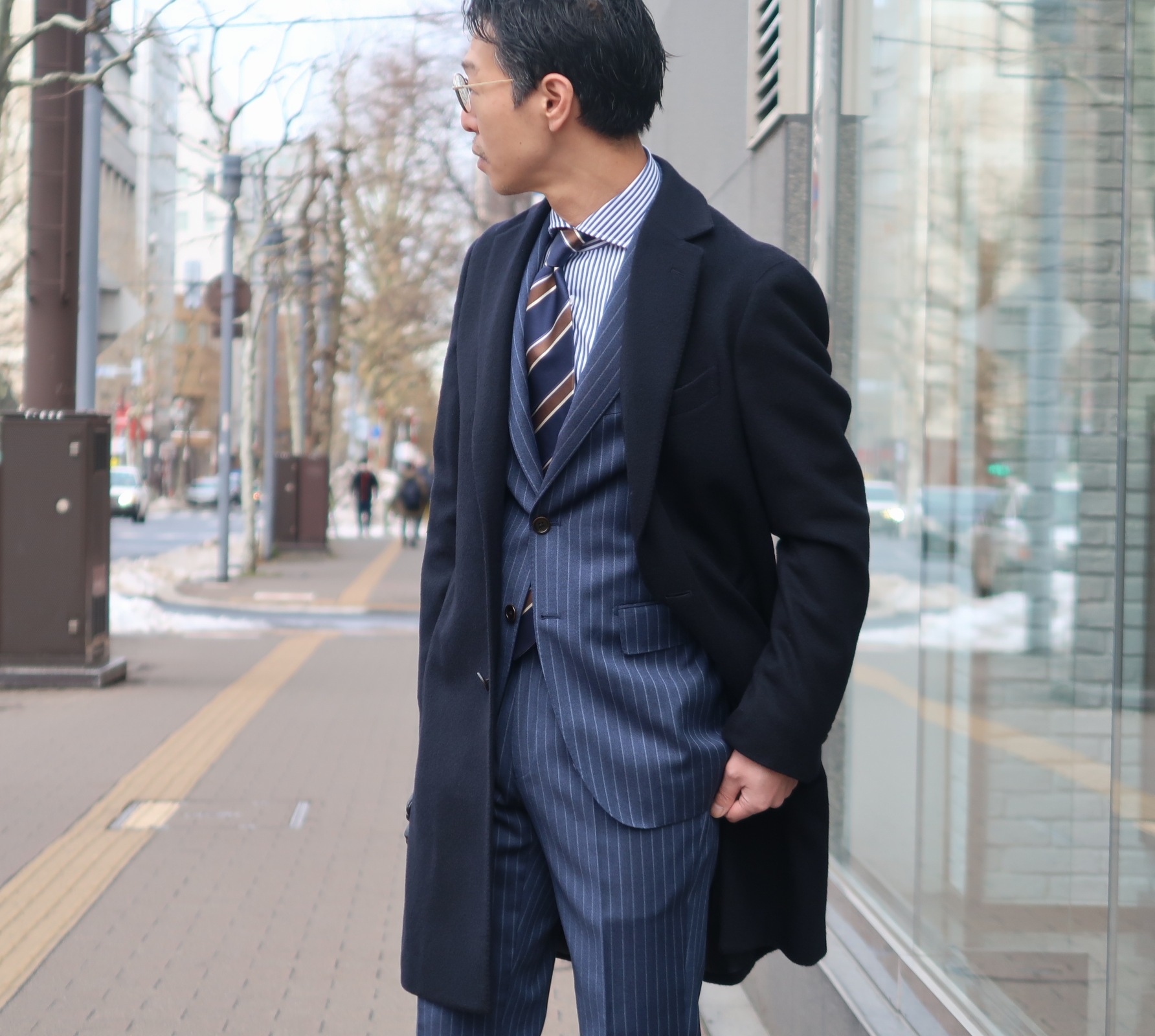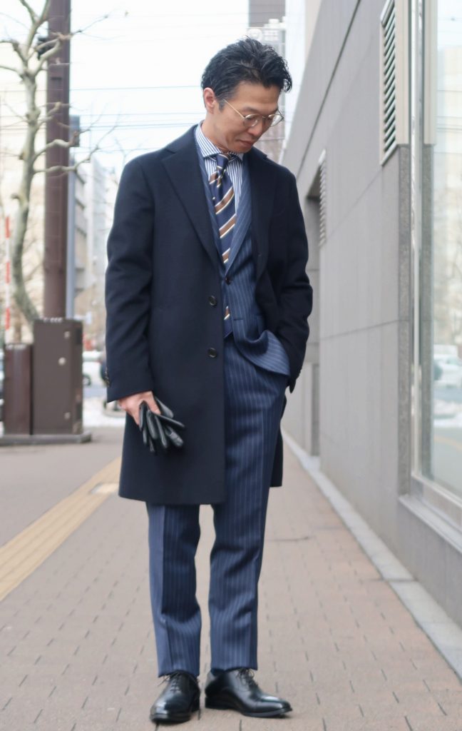 濃紺のコートにチョークストライプのブルースーツを合わせて