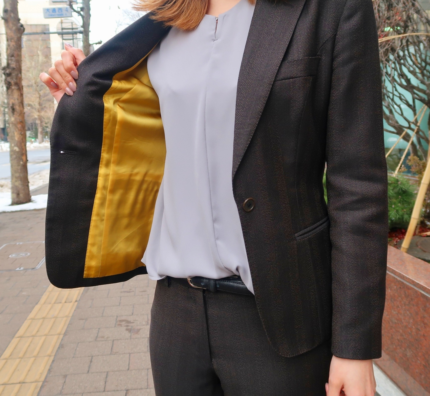 女性らしい仕立てのジャケットにこの色柄が乗ることでビジネスシーンにおいて信頼感が増すこと間違いなしです👔✨