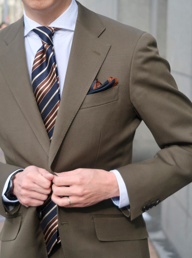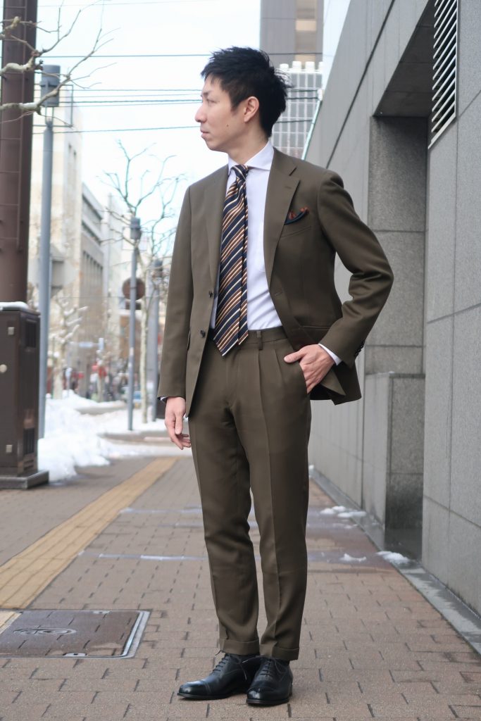 深いグリーンが特徴的な色合いのスーツ✨