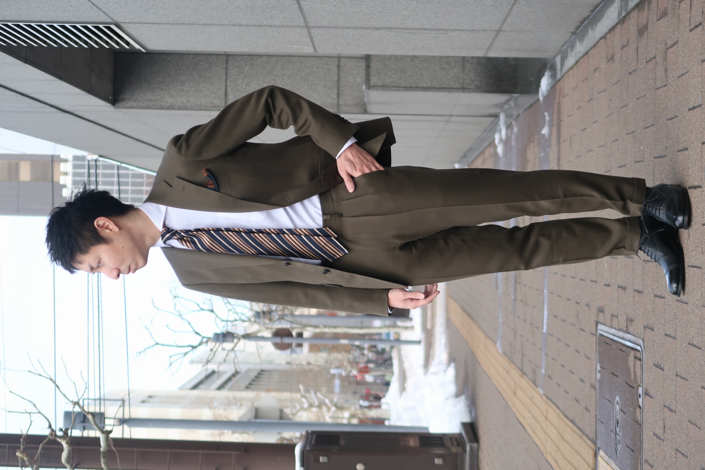 ヘリンボーン柄のブラウンスーツは柄のピッチ幅が広い為見る方にしっかりとした印象を与えます😊✨