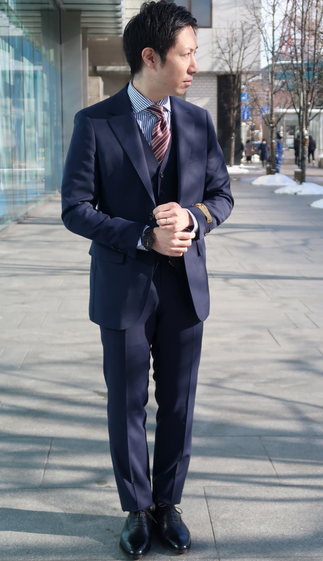 シャツ、ネクタイを変える事でビジネスのみならずフォーマルシーンにも対応できる