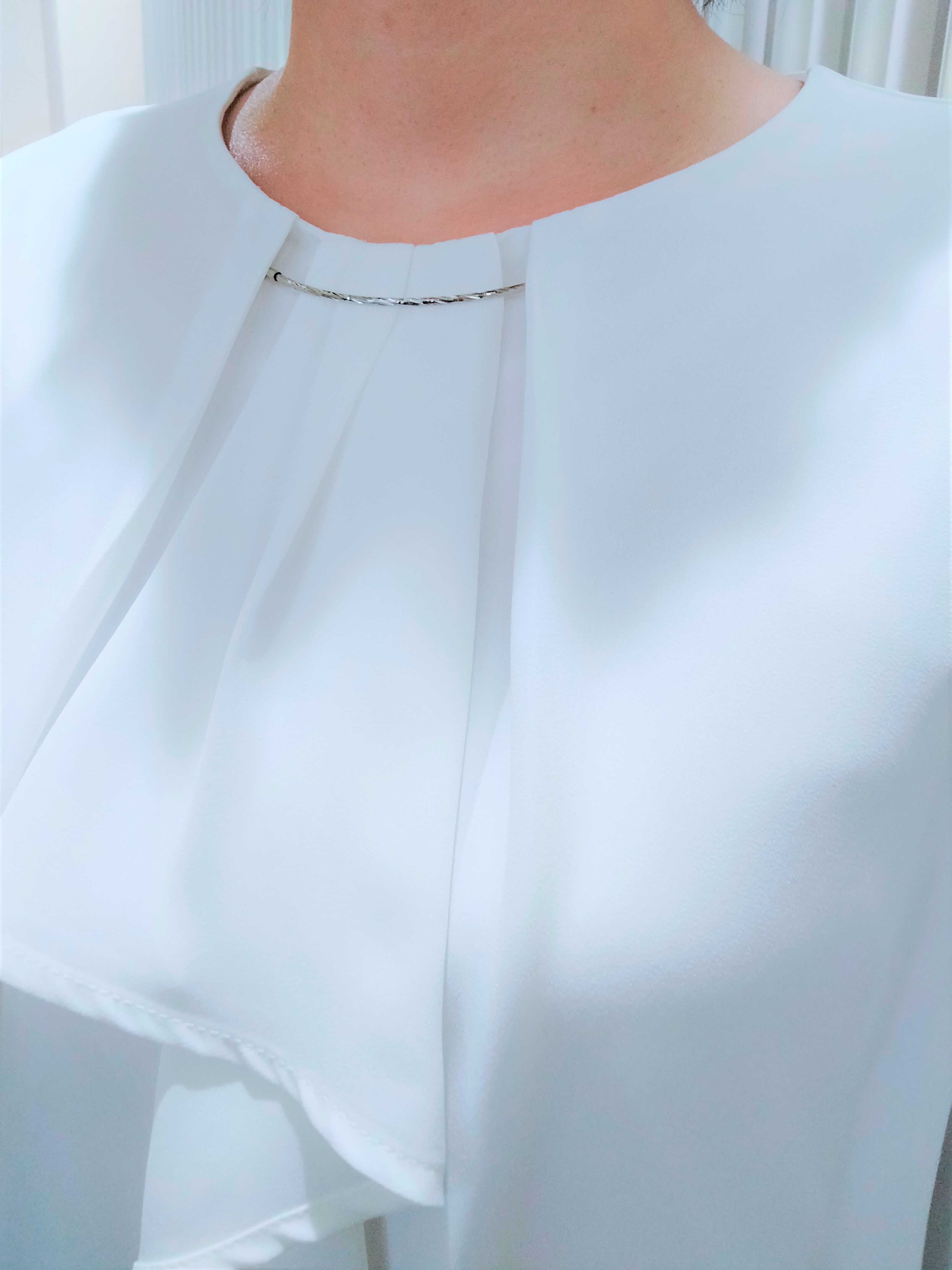 シンプルになりがちなホワイトカットソーも首元のデザインで