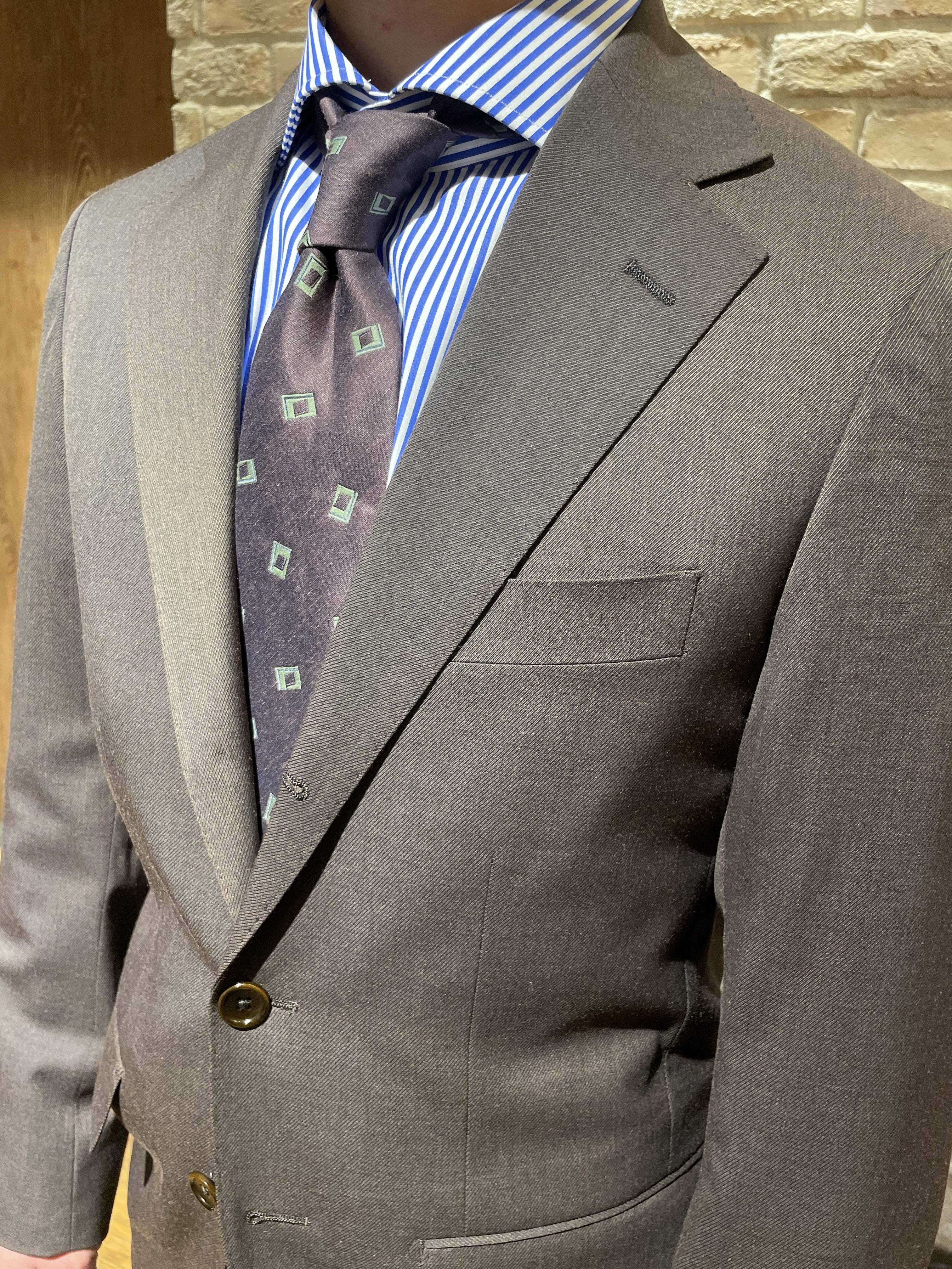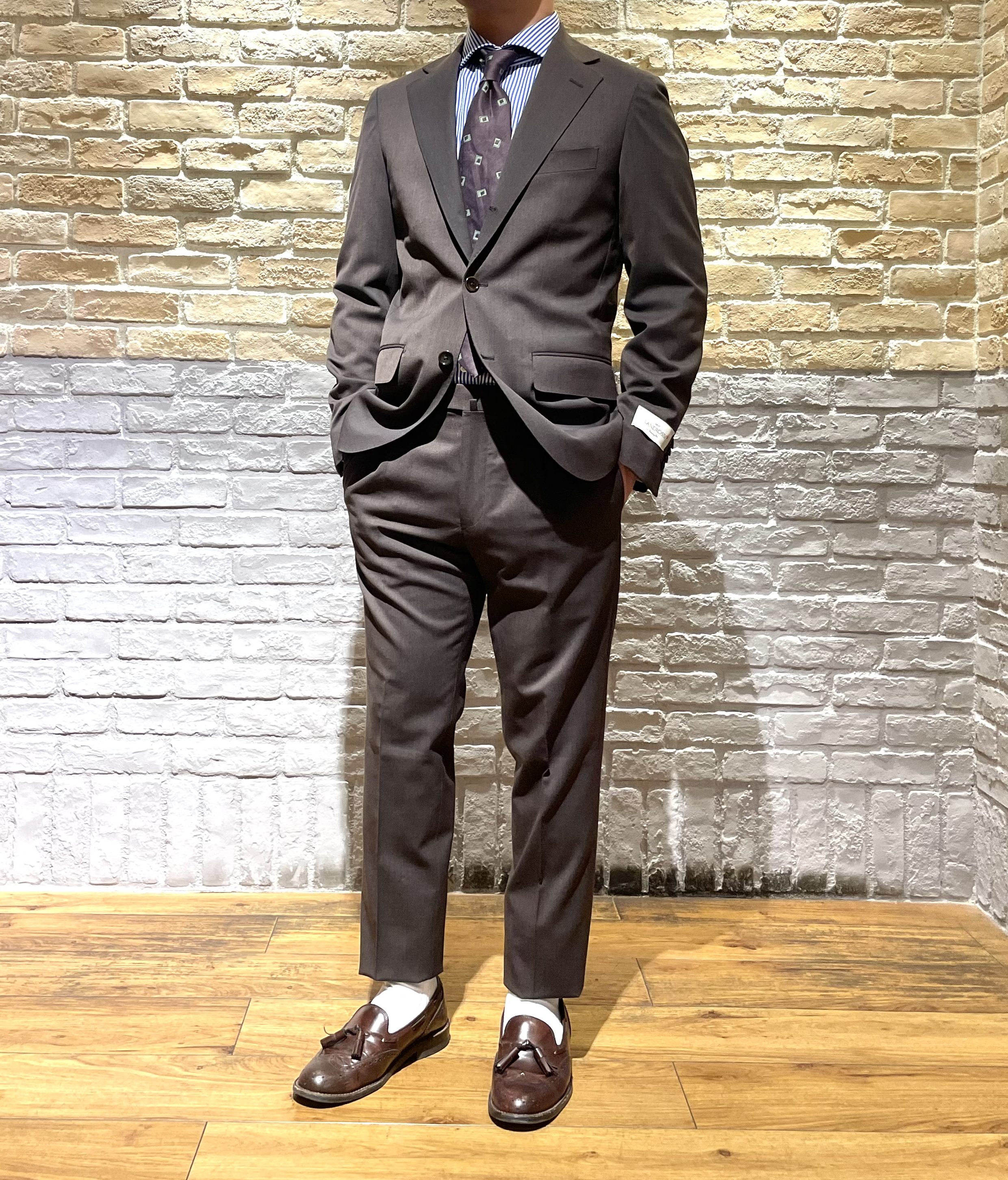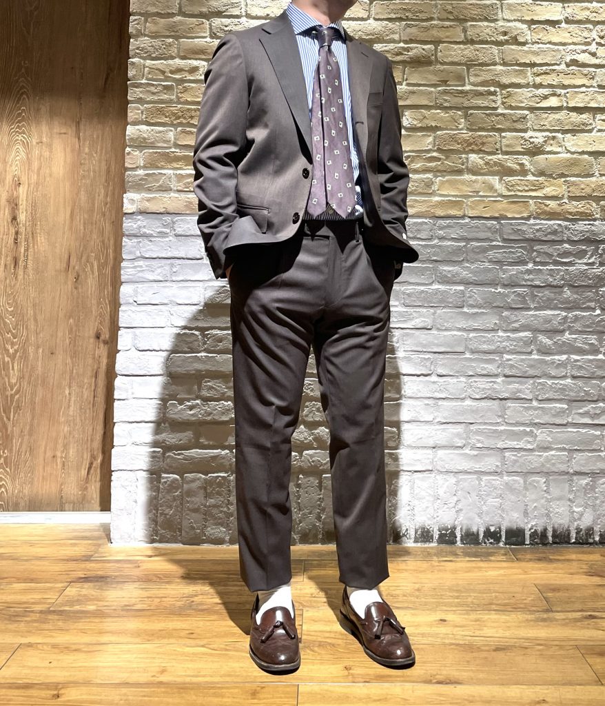 イタリア・Marzotto社の生地を使用したブラウン無地のように見えますが、メランジ調で落ち着いた雰囲気のスーツです。