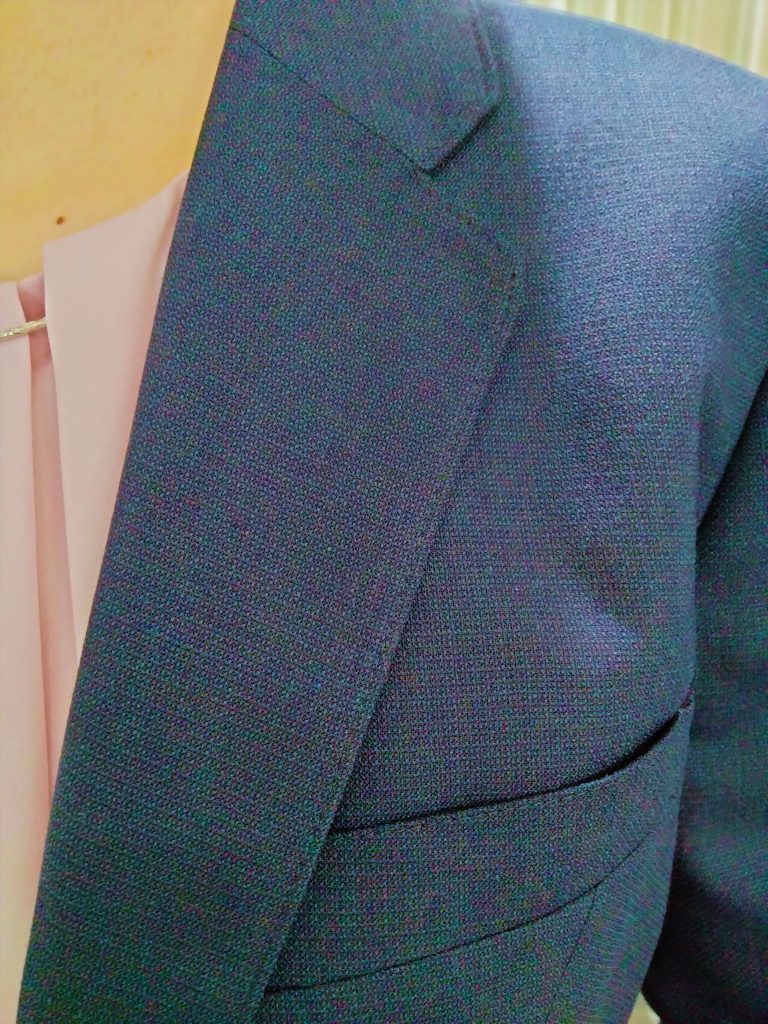 肩パッドが無く、ウエストがくびれたデザインのジャケットと