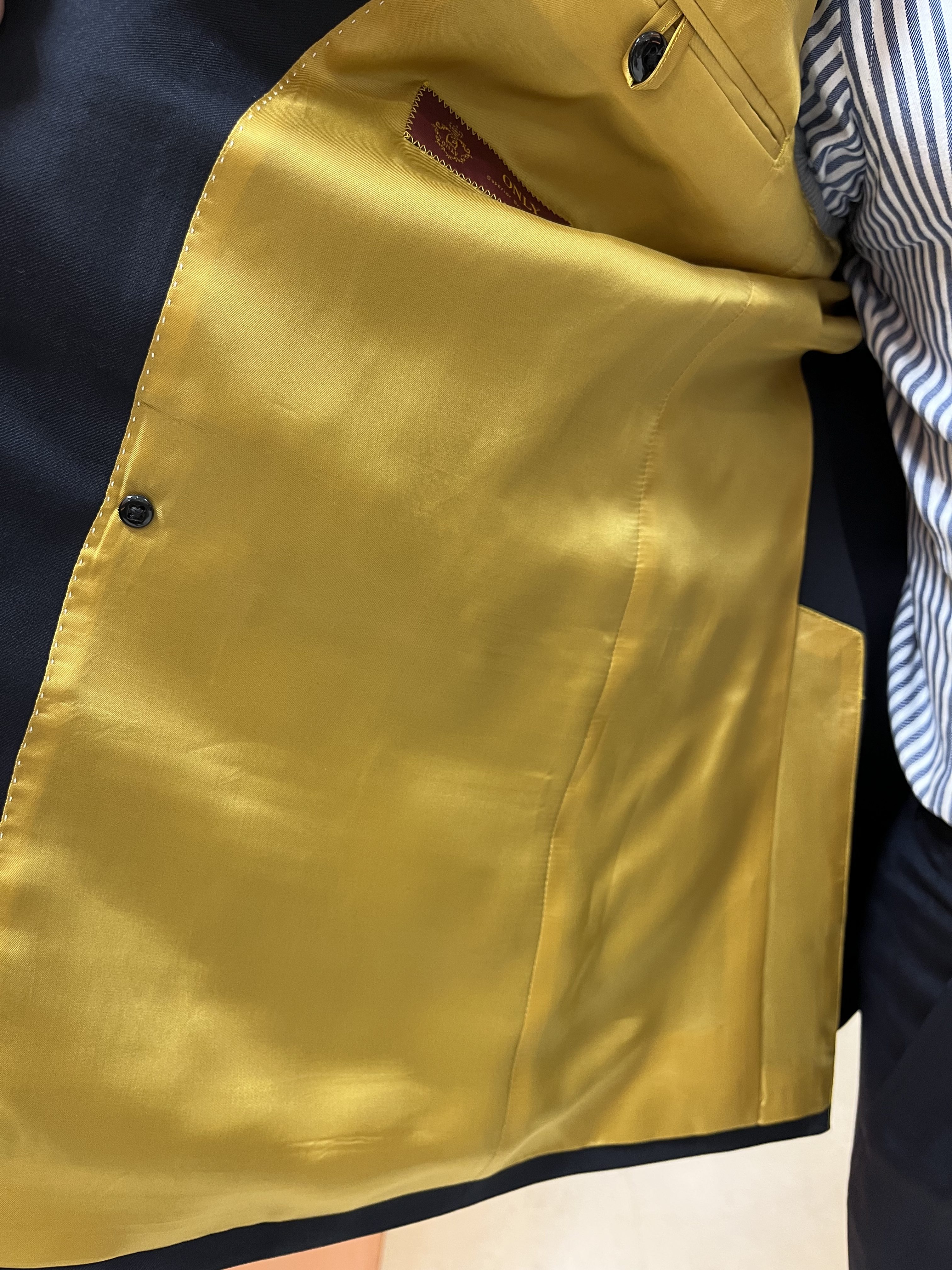 あまり重い見た目にならないように裏地は鮮やかな黄色をチョイス!ボタンもホワイトメタルのボタンにし、3ボタンの本切迫!!