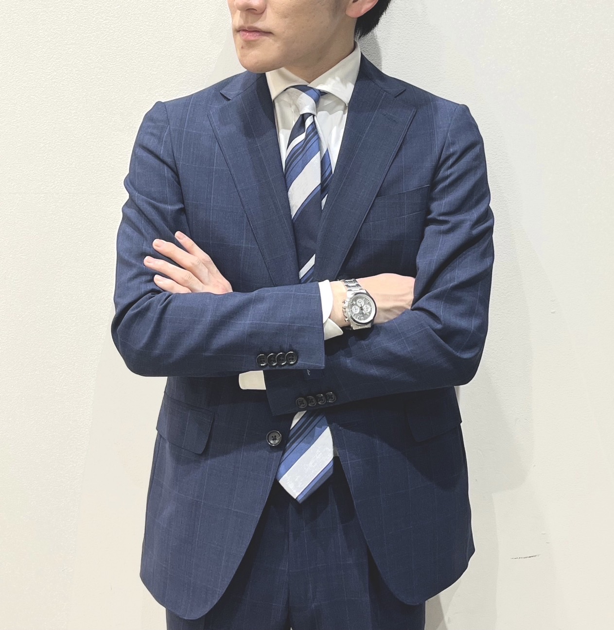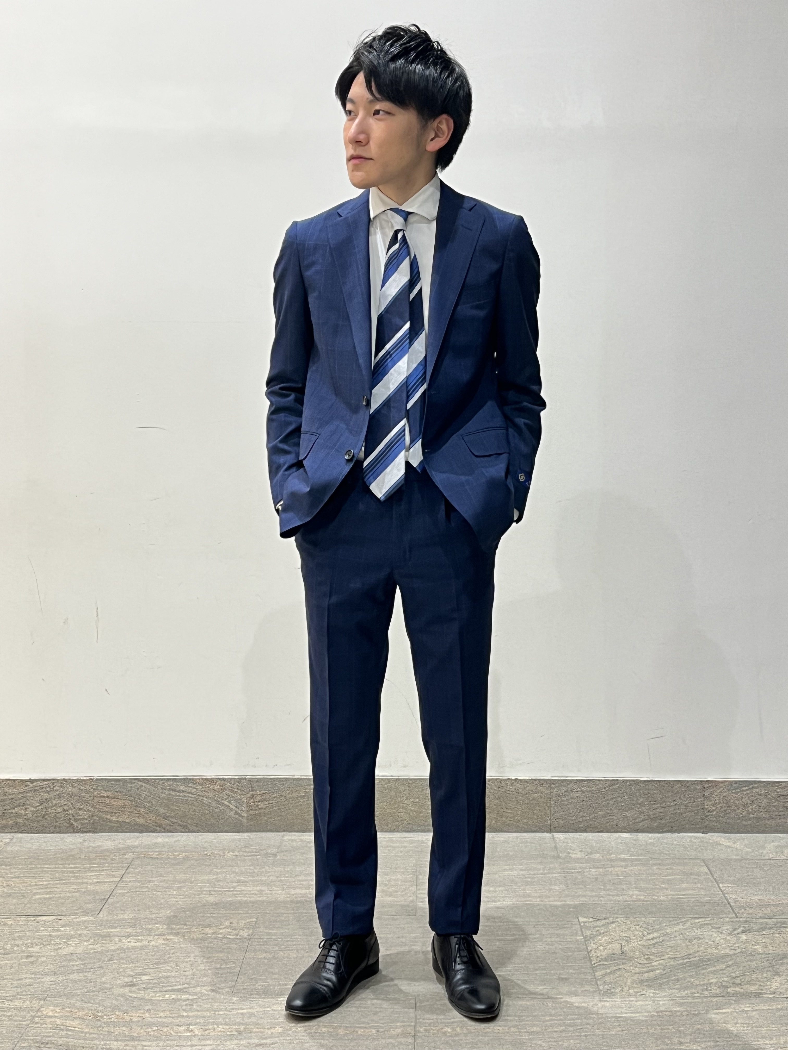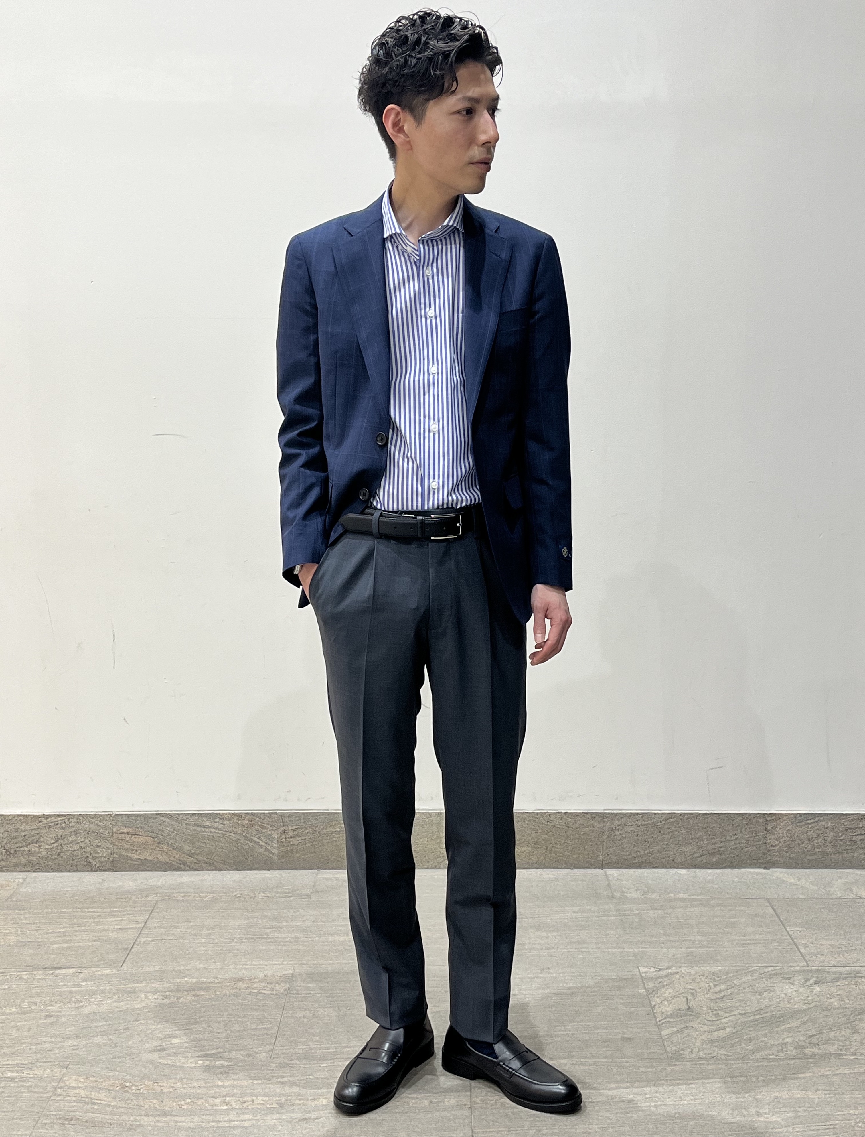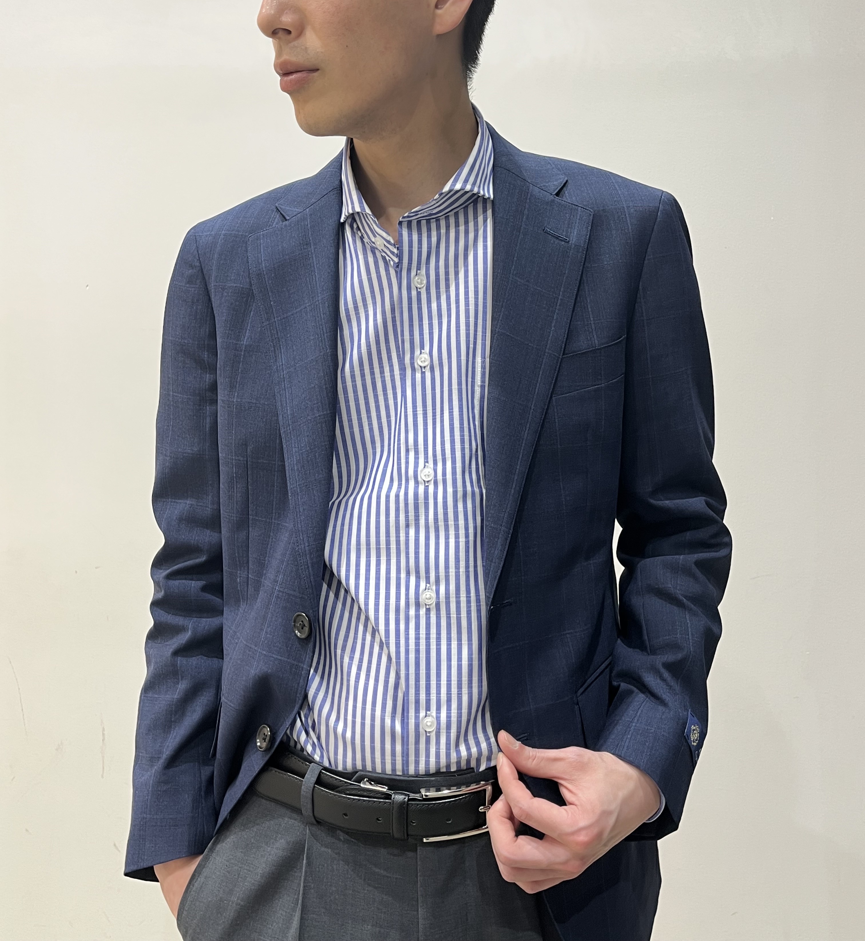 さりげないブルーのウィンドーペン柄が適度なカジュアルさとクラシックさを演出してくれます😍