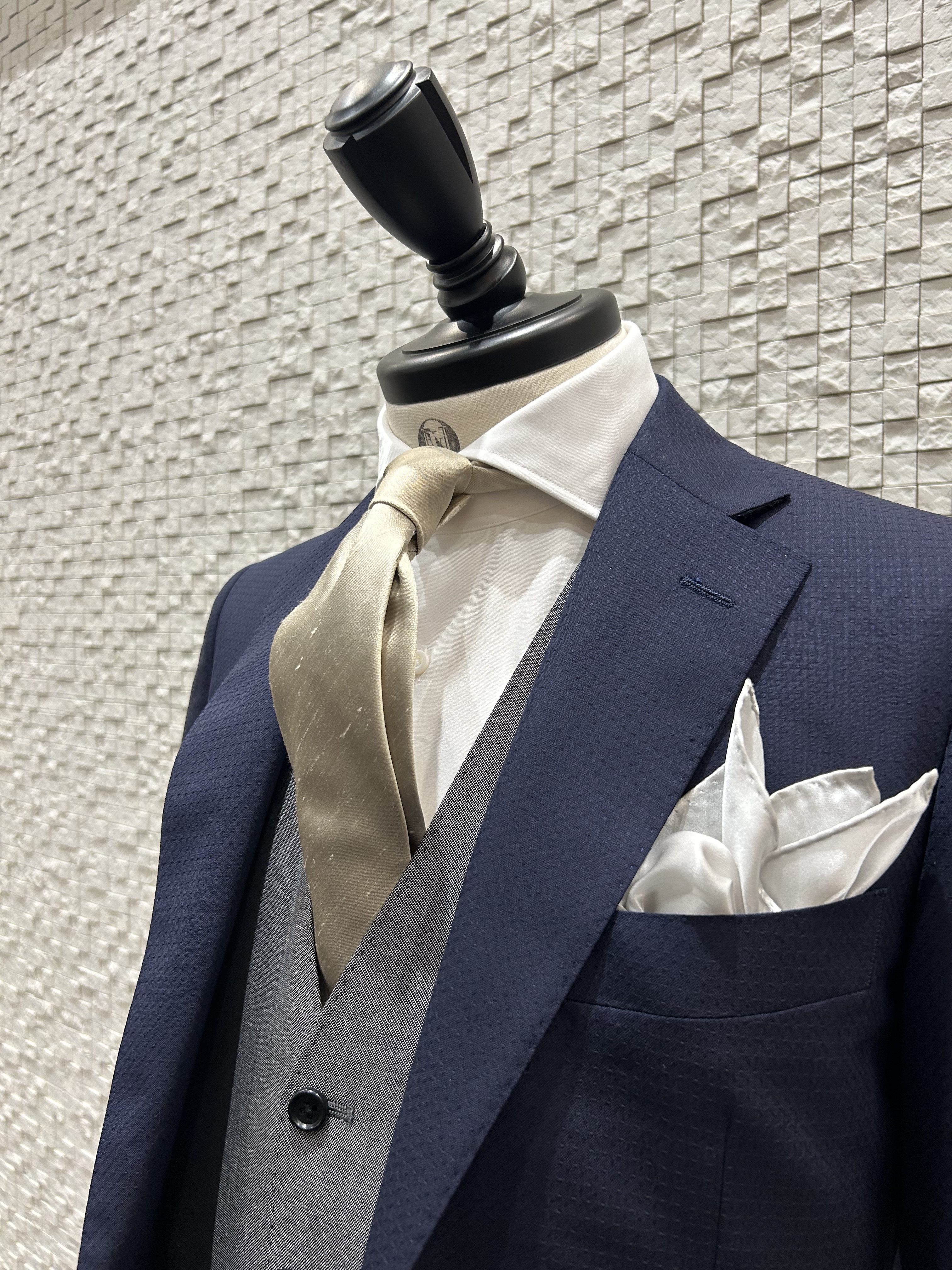 一見、ビジネスシーン王道のネイビースーツ、ベストを合わせるだけで華やかに!