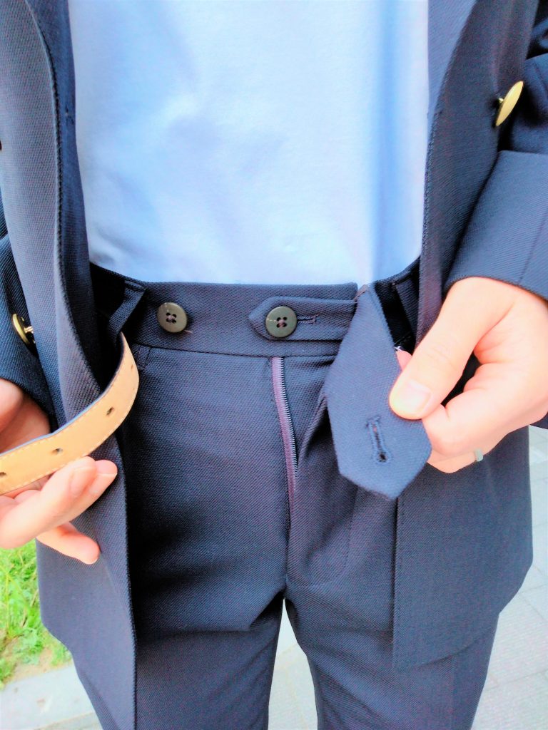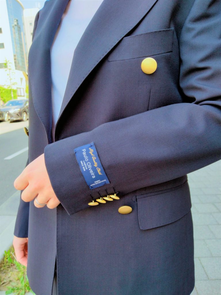 トレンドの金釦が目を惹くネイビーブレザーは、ポルトガルの PAULO OLIVEIRA社のストレッチ素材。