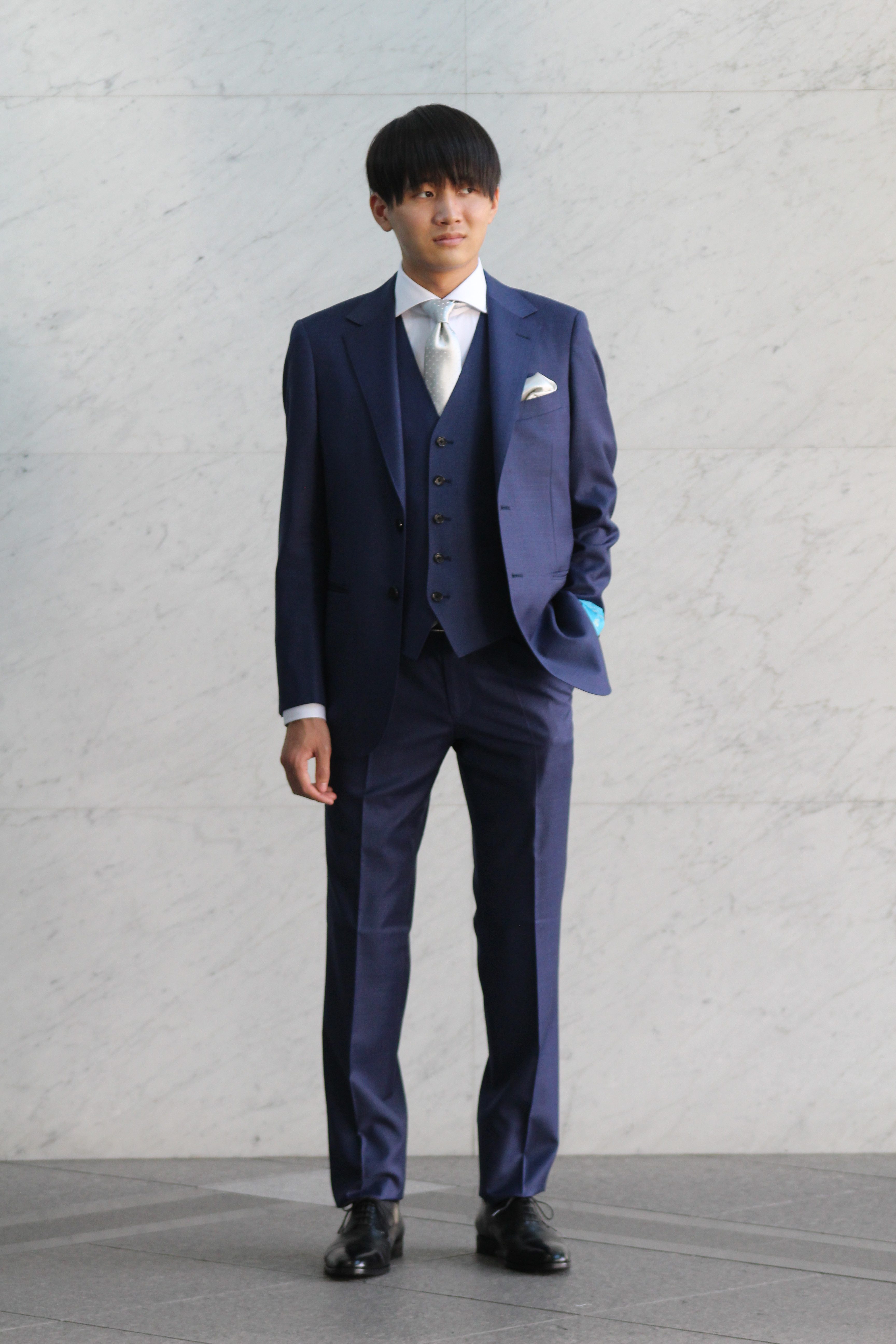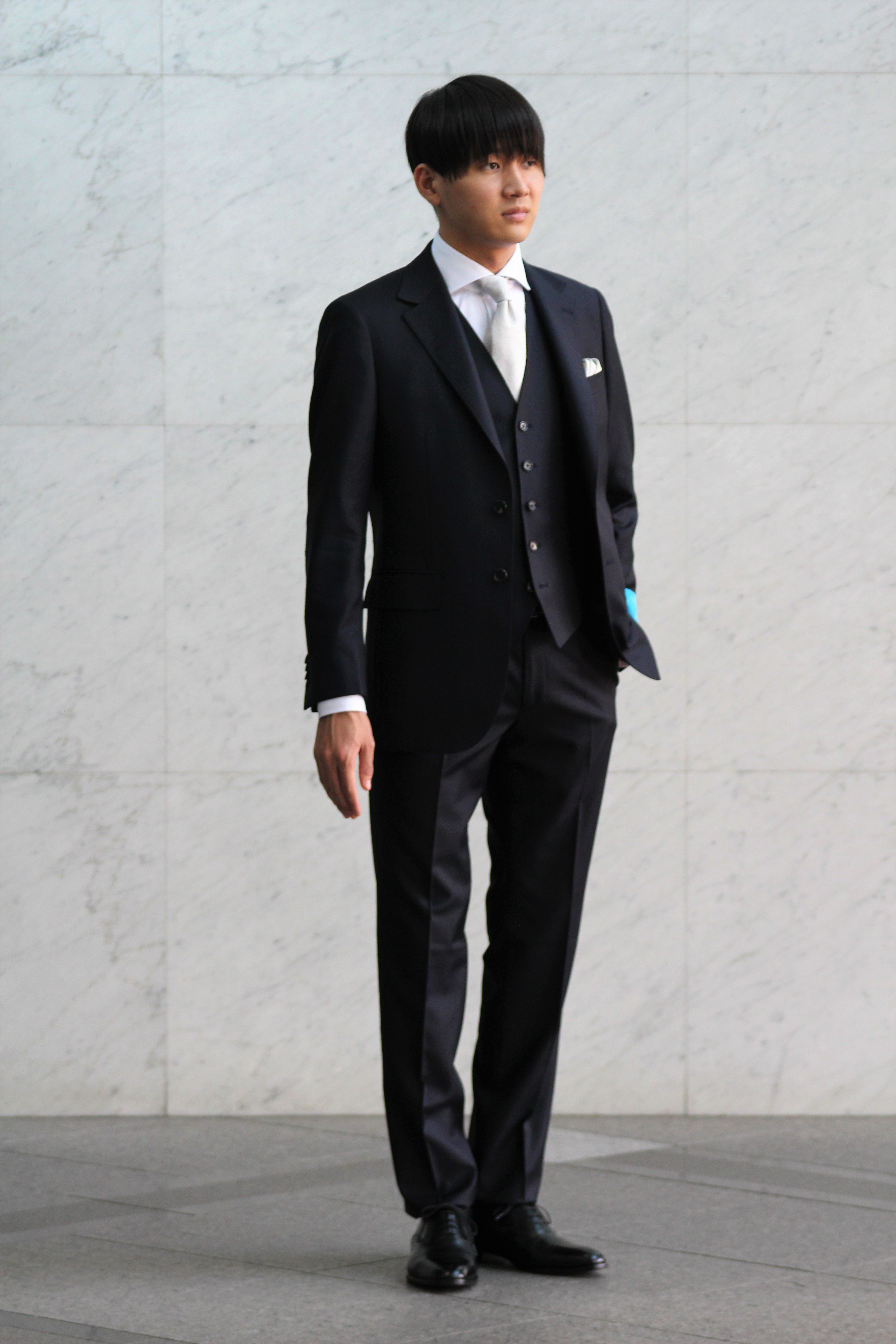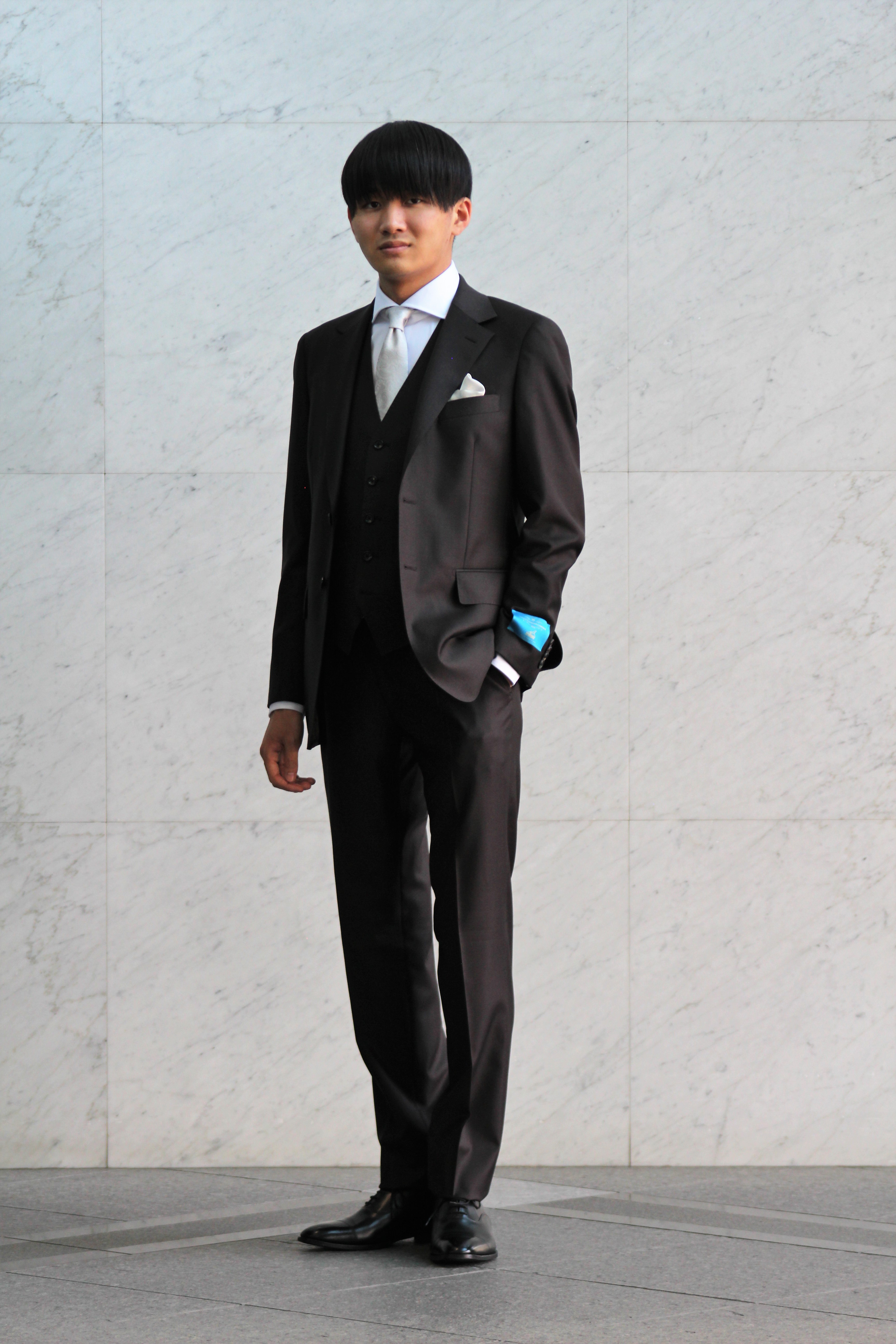 ネクタイとチーフを変えてドレス感を演出しています。